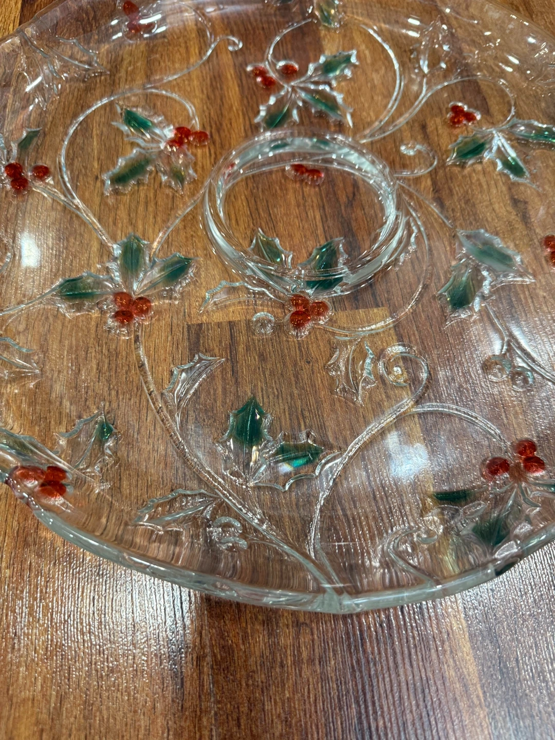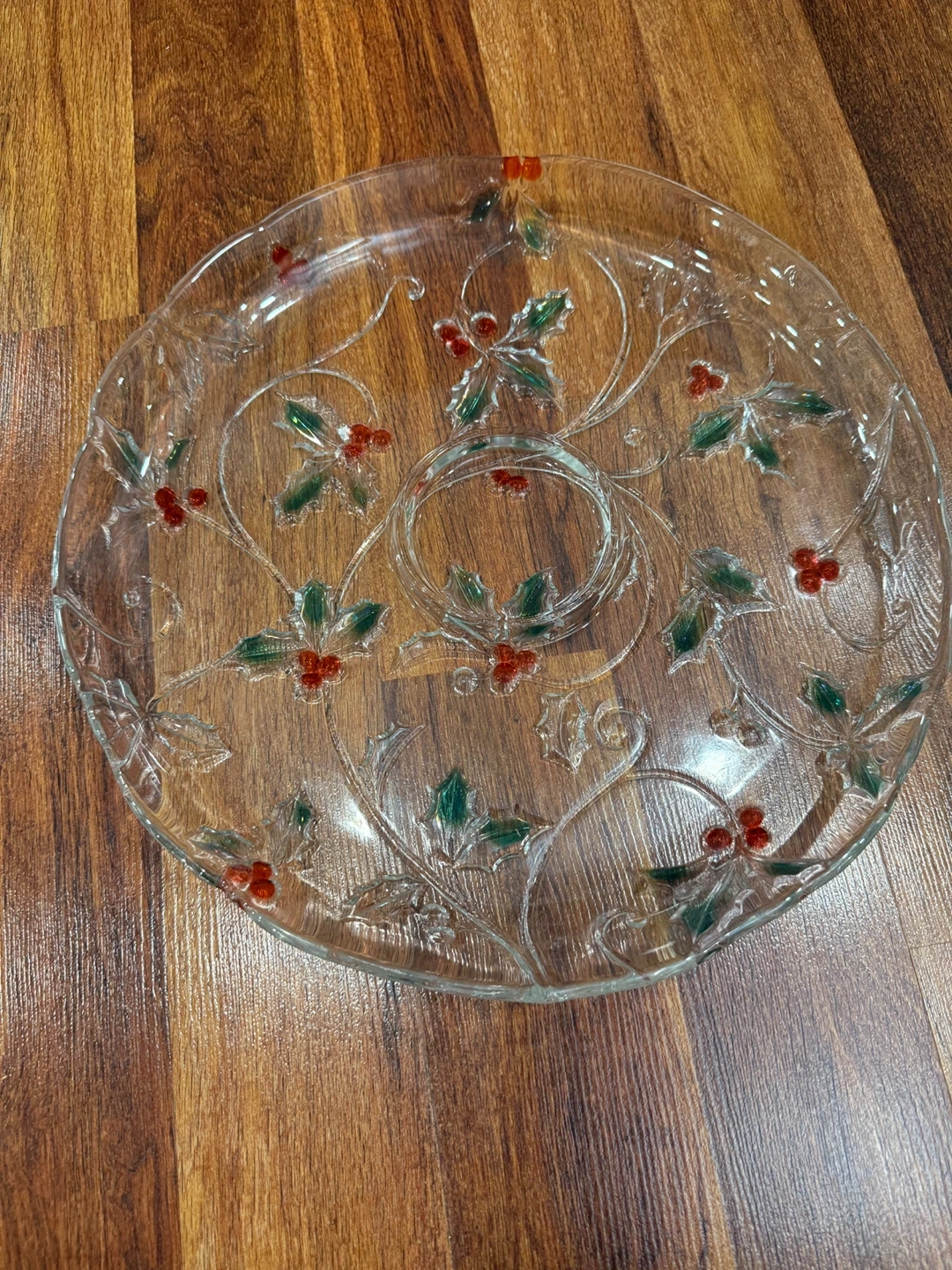Selling a lovely clear glass serving platter. It features a festive holly and berry design, perfect for the holidays or any special occasion! It's in great shape and ready to add a touch of elegance to your table