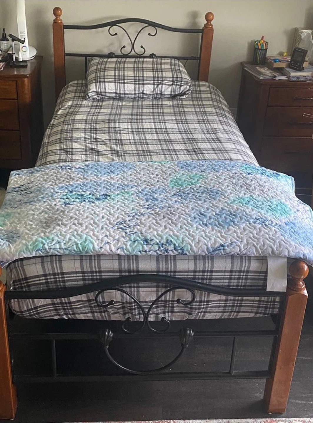 Selling a twin-size bed frame with a metal and wood design. It's in good condition and ready for a new home! Perfect for a kid's room or a guest room