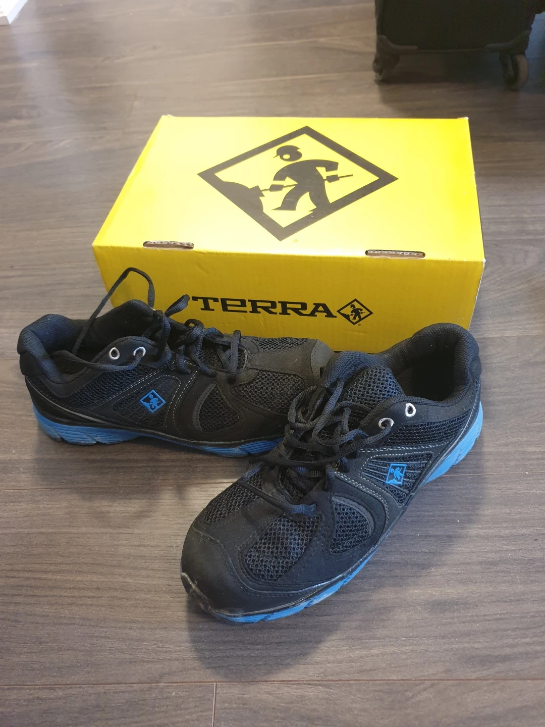 Selling a pair of Terra men's work shoes, model MC170579. They are black with blue accents and come with the original box.