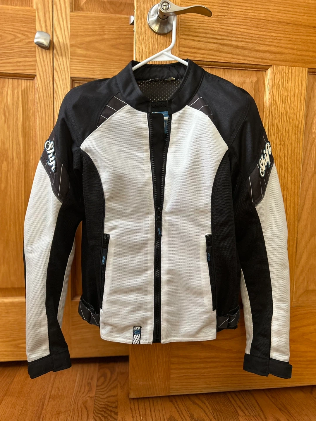 Selling a Shift motorcycle jacket, women’s size small. It's black and white with blue trim and 100% polyester. Jacket is light weight with elbow, back, and shoulder pads. The jacket is in great condition and ready for a new rider!