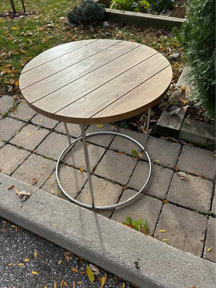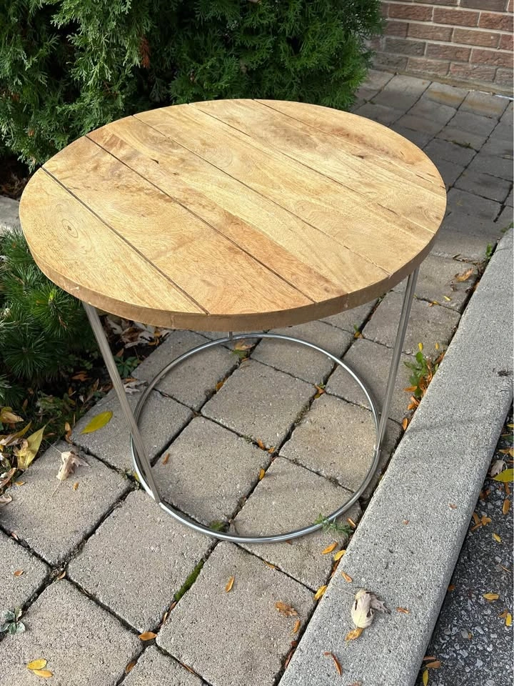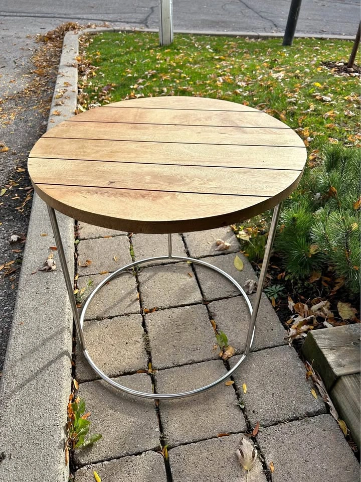 1856 cm tall × 56 cm diameter. Solid light oak top with natural grain, supported by a sleek chrome frame with three legs and a circular base ring. Perfect compact accent or side table. Excellent condition. Pick up only. If the add is up, the table is available.