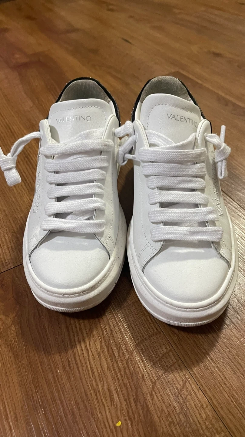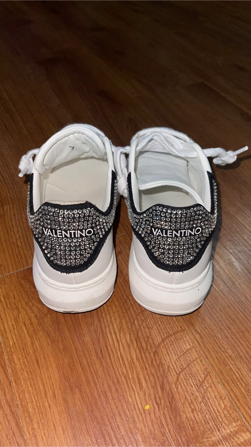 Selling a pair of Valentino white leather sneakers. These stylish sneakers feature a unique design with embellishments on the back. They are in great condition and ready for a new home! (Authentic)