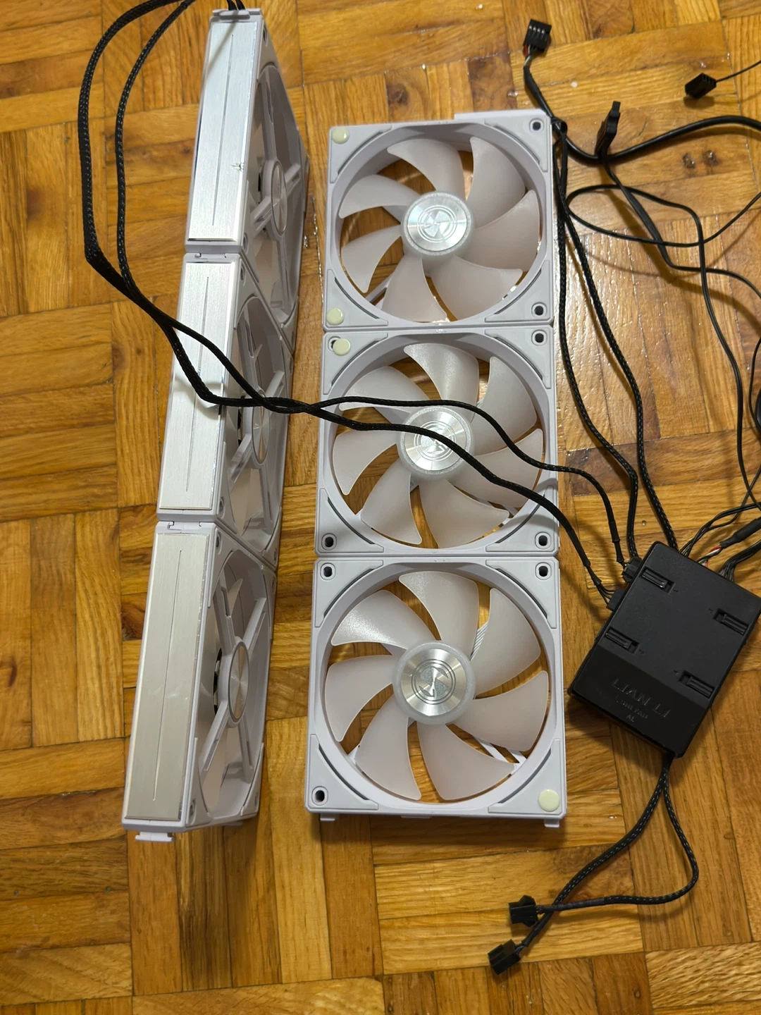 A set of three Lian Li UNI FAN SL120 V2 RGB white 120mm computer fans. Includes the controller hub for managing RGB and fan speed. These are great for building a clean and visually appealing PC. Connectors are standard. If interested contact me at (647) 612-1551 total I got fans I sale it for $240