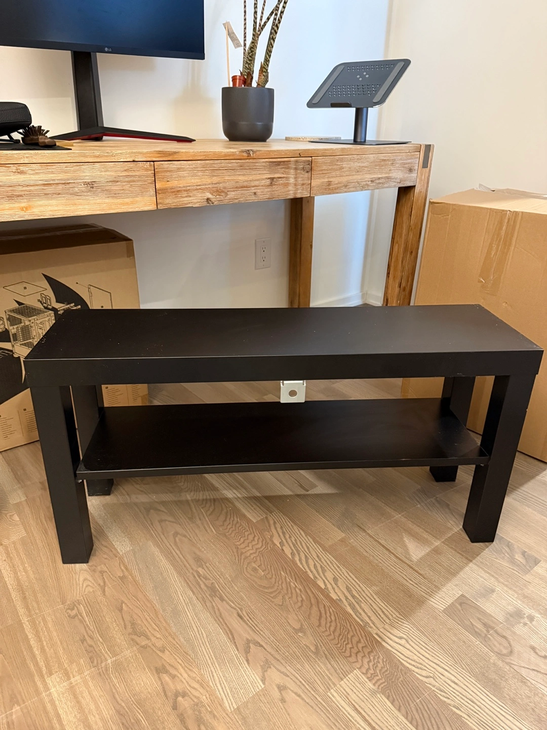 Simple black TV stand. Features a lower shelf. Good condition. Perfect for small spaces or media storage.