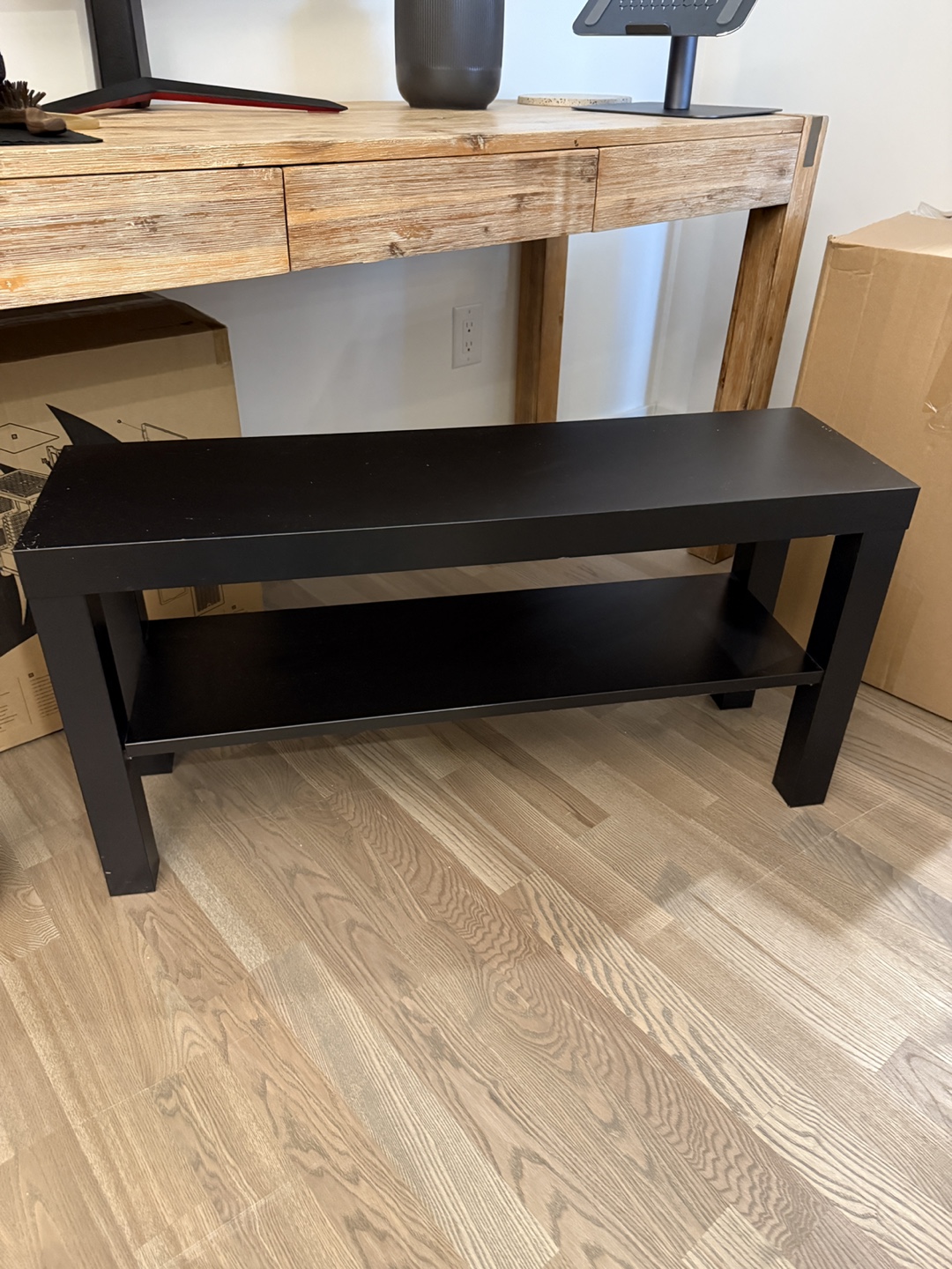 Simple black TV stand. Features a lower shelf. Good condition. Perfect for small spaces or media storage.