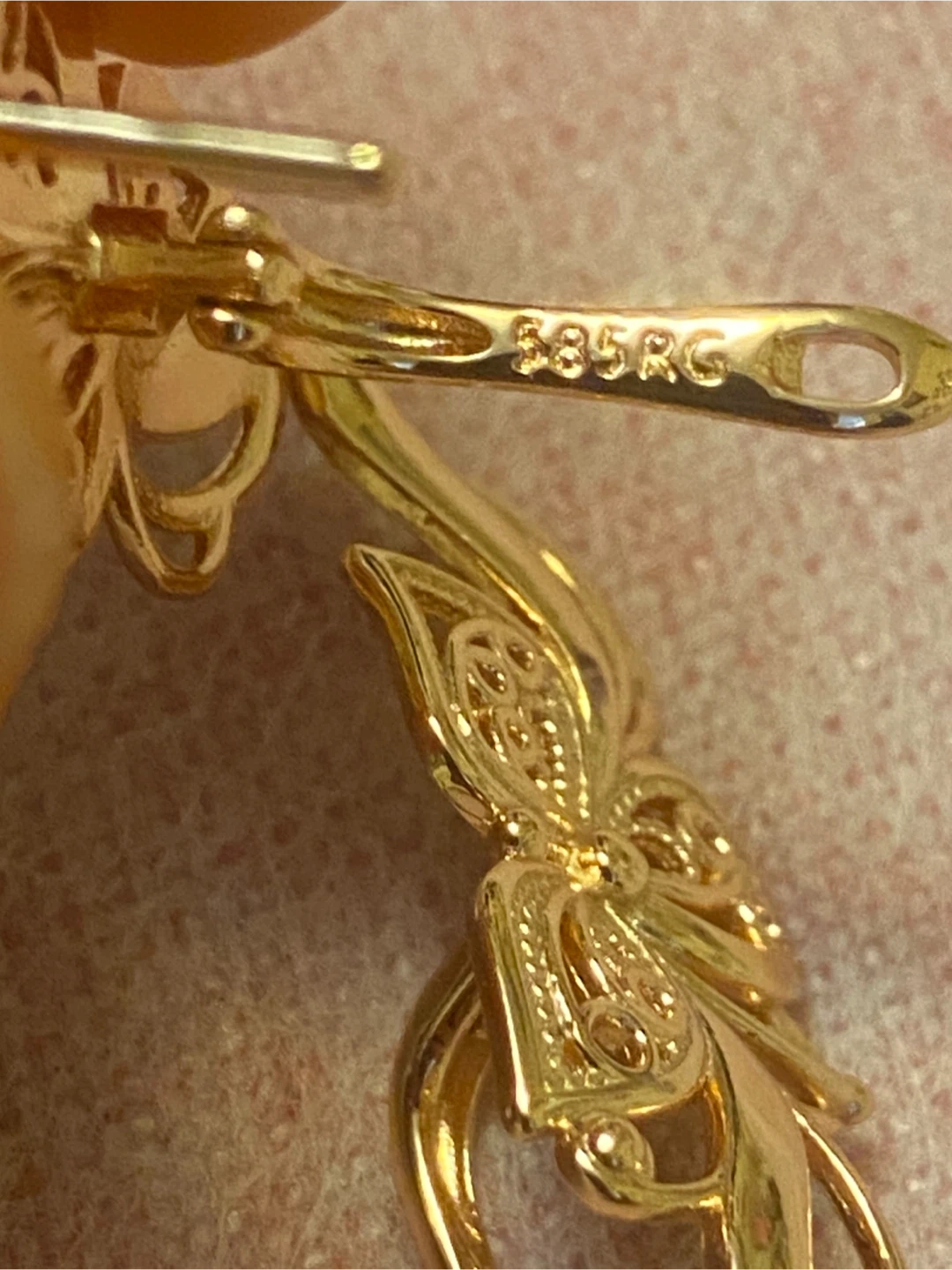 928Selling a pair of beautiful gold butterfly earrings. They are marked '585RG that means Rose Gold plated. The earrings feature a delicate butterfly design with intricate details. They measure approximately 1 inch in length Not a Gold ! Gold Plated stainless steel earrings
