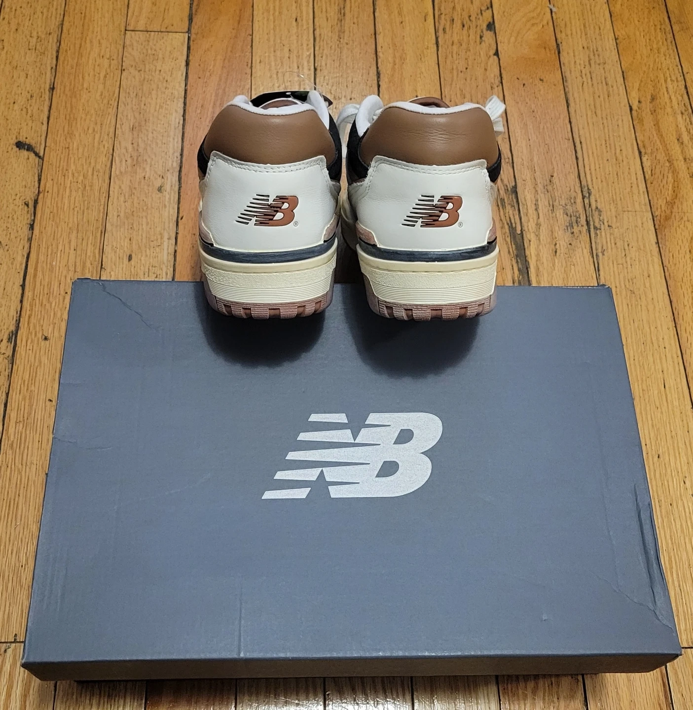 Selling a pair of New Balance 550 sneakers in white and brown. These come with the original box, so they're ready for a new home
