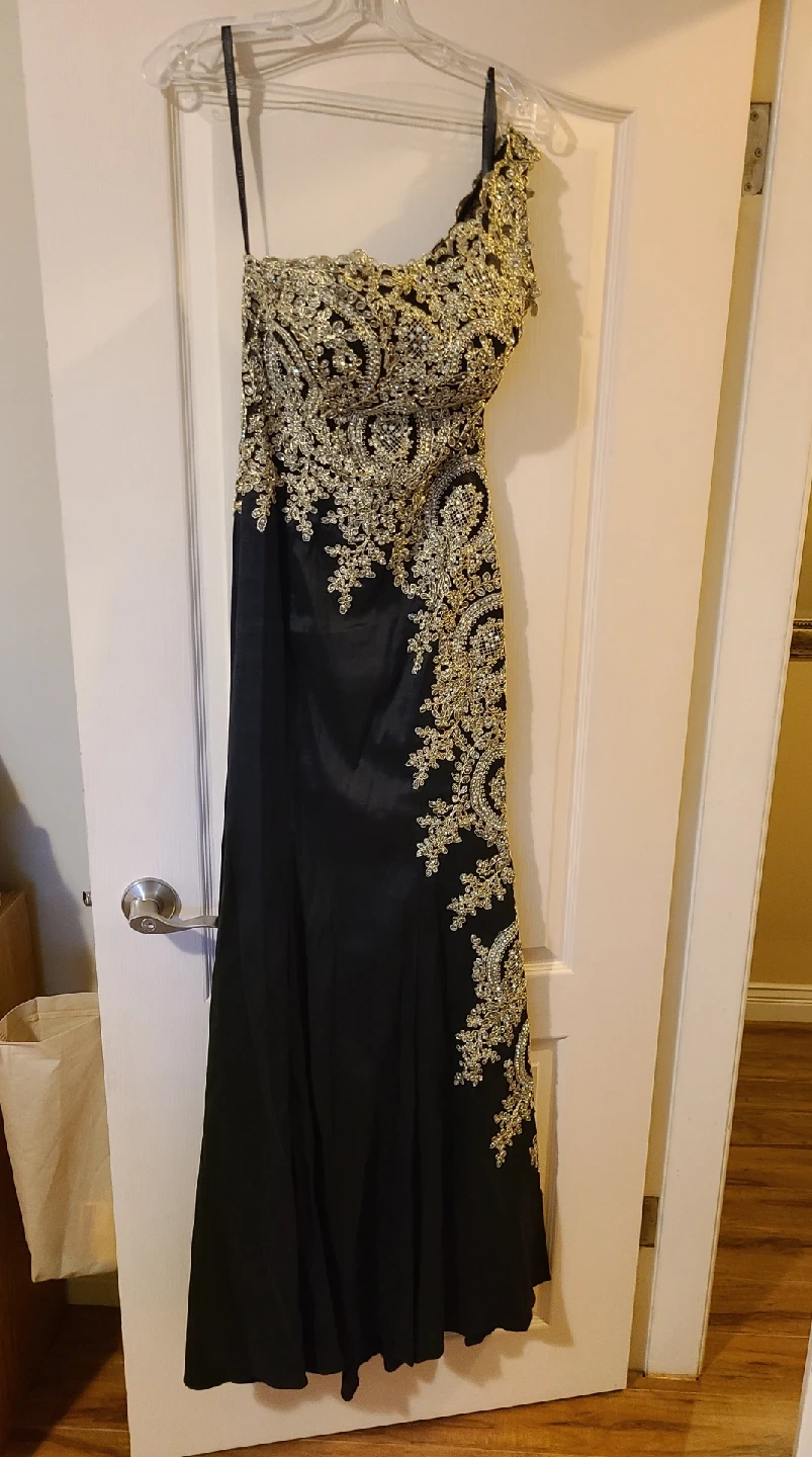 Selling a beautiful Morilee Madeline Gardner dress! It features a stunning black and gold design. Perfect for a special occasion - gala, graduation, wedding
