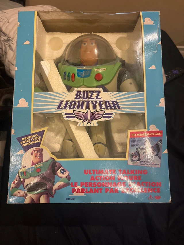 Blast off to infinity and beyond with this vintage original Buzz Lightyear talking action figure, model No. 62809, still in its original packaging! This nostalgic collectible features classic phrases and sounds, bringing the beloved Toy Story character to life. Note that due to its age, the packaging shows wear, adding to its vintage charm. This Buzz Lightyear figurine is a fantastic find for collectors and fans alike. The item has never been out of the box, but the box has some wear. Here are some additional details: * Original packaging included * Talking feature with classic phrases * Model No. 62809 I'm asking $60 CAD. Considering it's a vintage toy and the box has some wear, this price reflects its collectibility and condition. Don't miss out on owning a piece of Toy Story history! If the ad is up, then yes, it’s still available – ready to join your collection and bring a smile to your face!