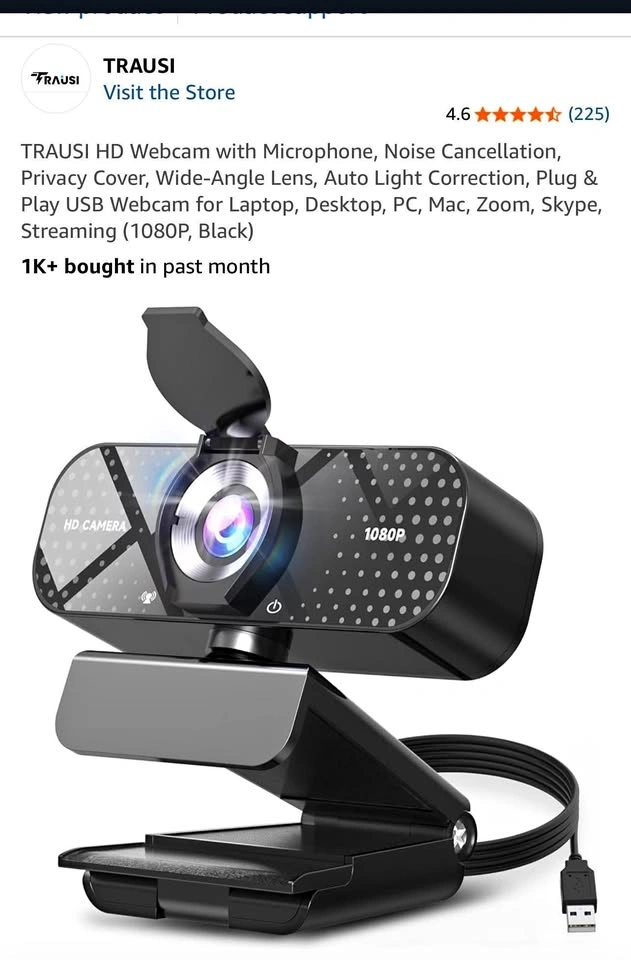 TRAUSI HD Webcam with Microphone, Noise Cancellation, Privacy Cover, Wide-Angle Lens, Auto Light Correction, Plug & Play USB Webcam for Laptop, Desktop, PC, Mac, Zoom, Skype, Streaming (1080P, Black). Let me know if you're interested!