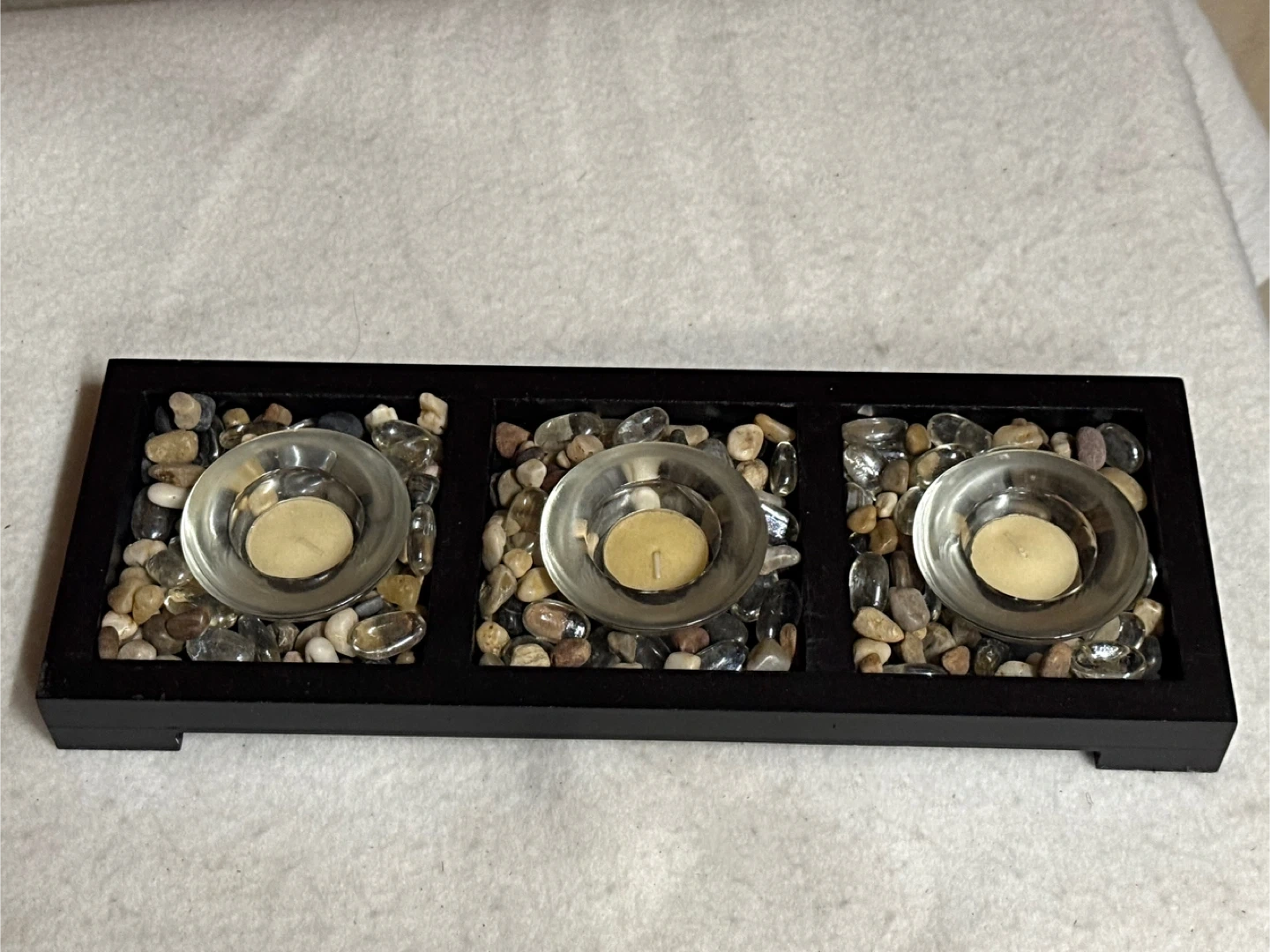 lovely tea light candle holder with three glass cups surrounded by decorative stones. It's perfect for adding a touch of warmth to any room!