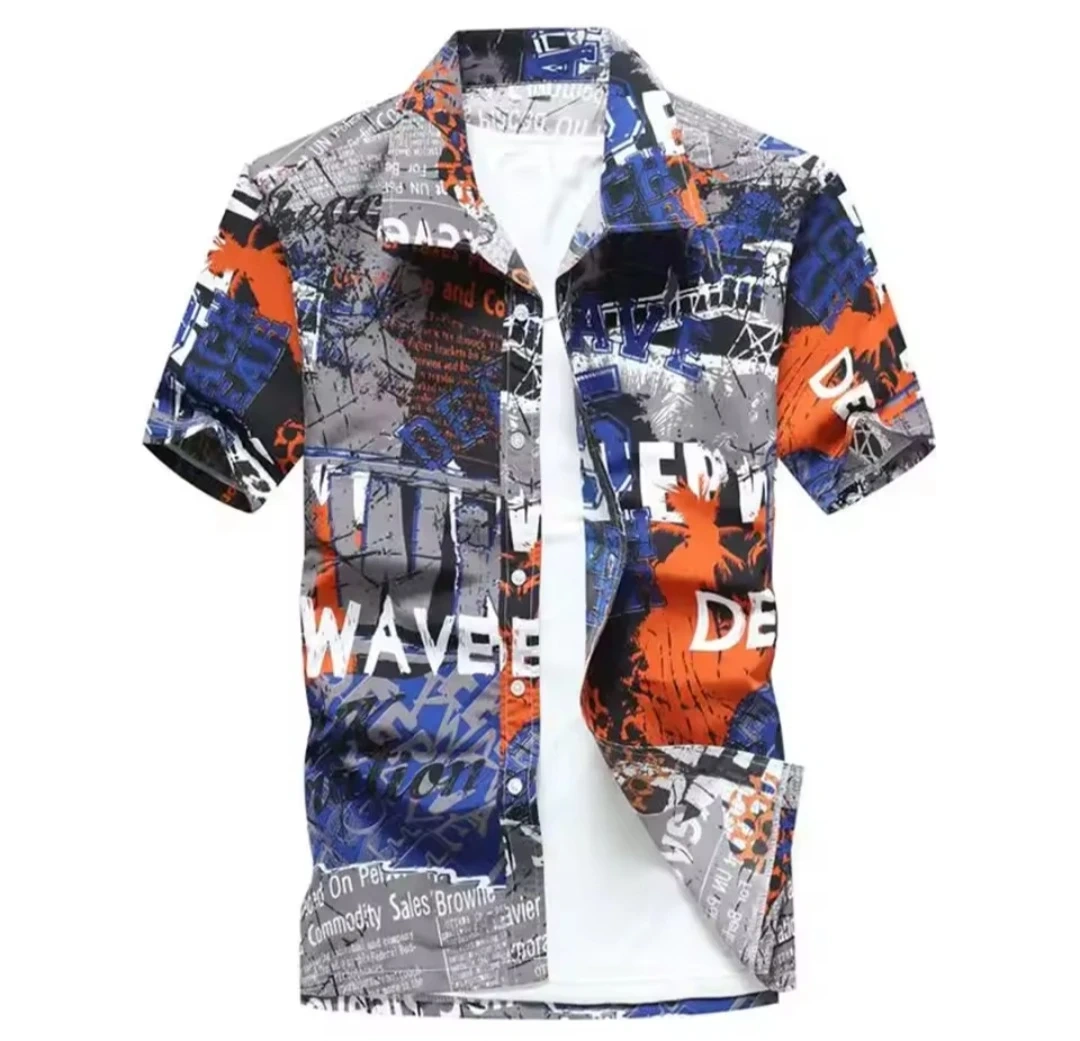 Here's a short-sleeved shirt with a vibrant pattern! Perfect for adding a bit of fun to your wardrobe. It's in great shape and ready for a new home