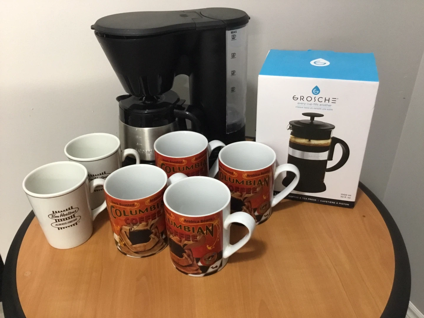 65Selling a Grosche French press, perfect for coffee or tea! It has a 1000 ml capacity, so you can make enough for everyone. Also included are some Tim Hortons and Columbia Coffee mugs to complete your set 5 cup coffee maker