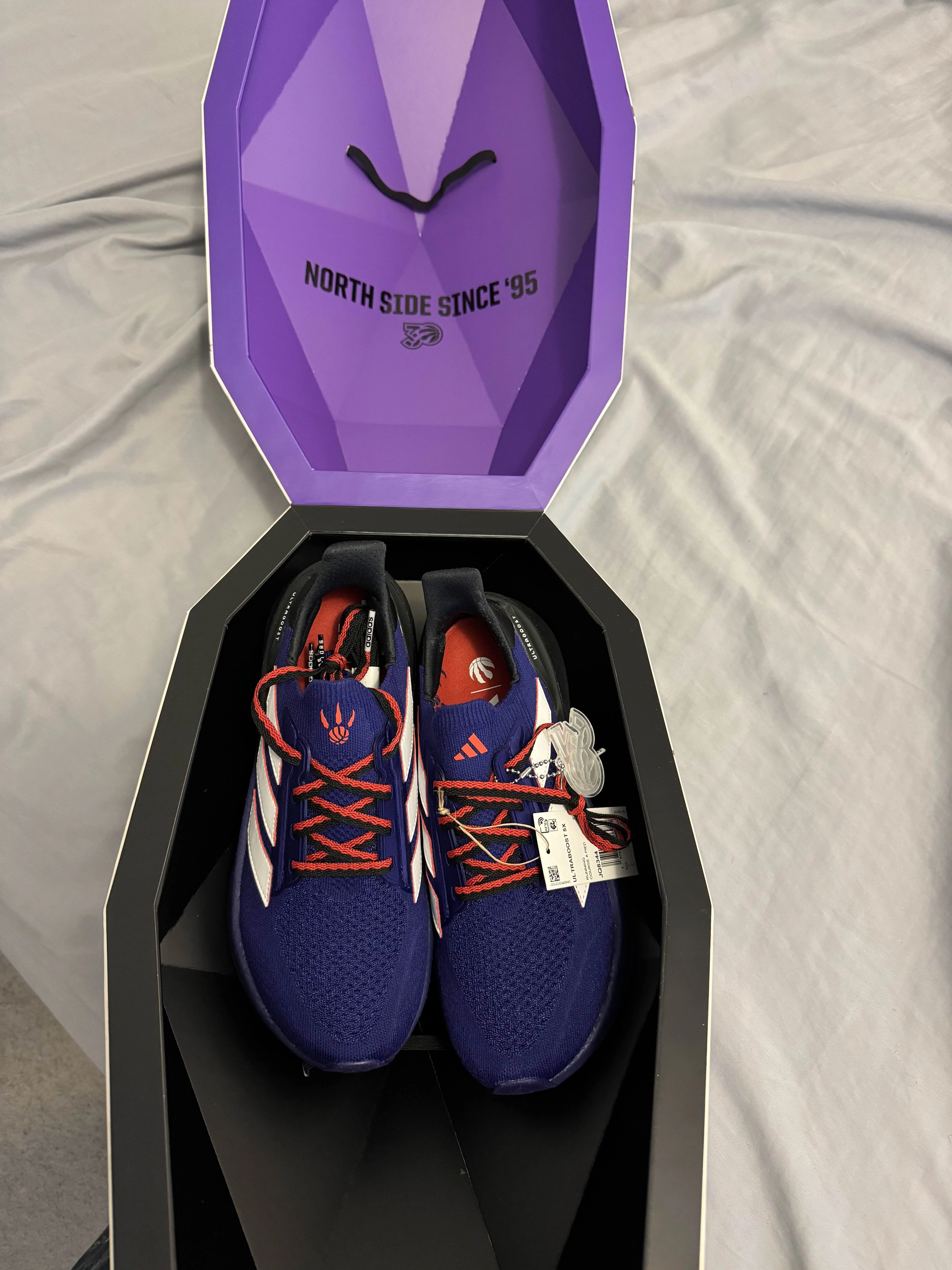This is a rare limited-edition Adidas UltraBoost 5X Raptors 30th Anniversary pair (style code JQ8344).