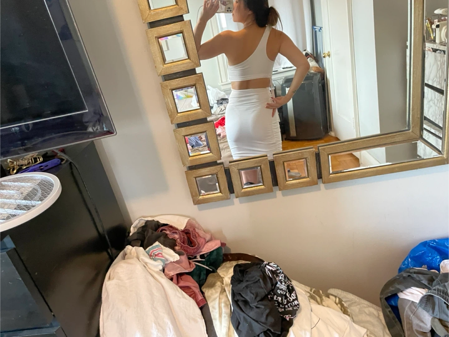 435A stylish white one-shoulder dress. Perfect for a night out or a special occasion! The dress has a unique cut-out design and a flattering fit.
