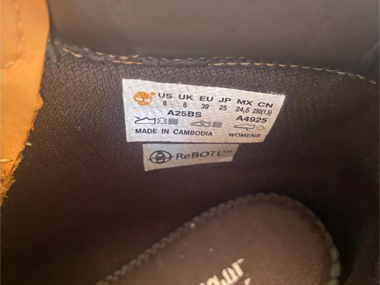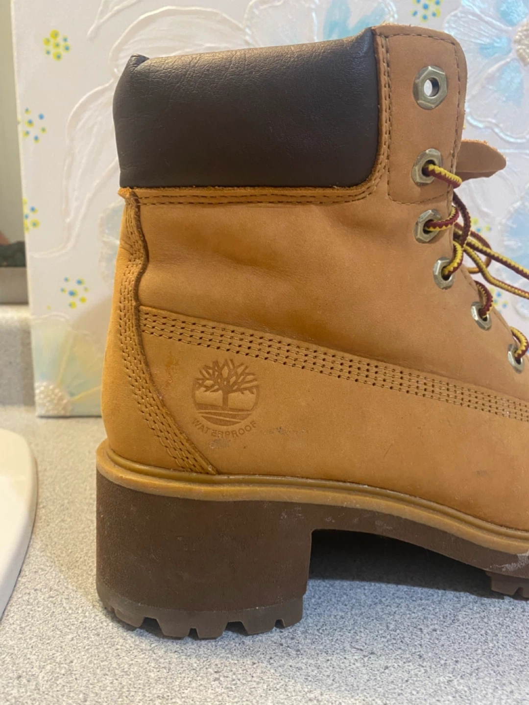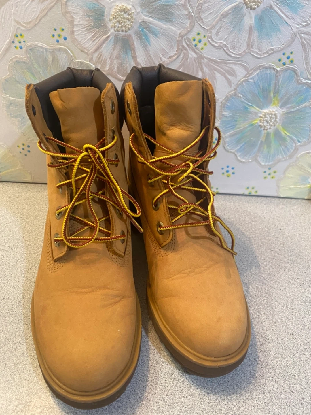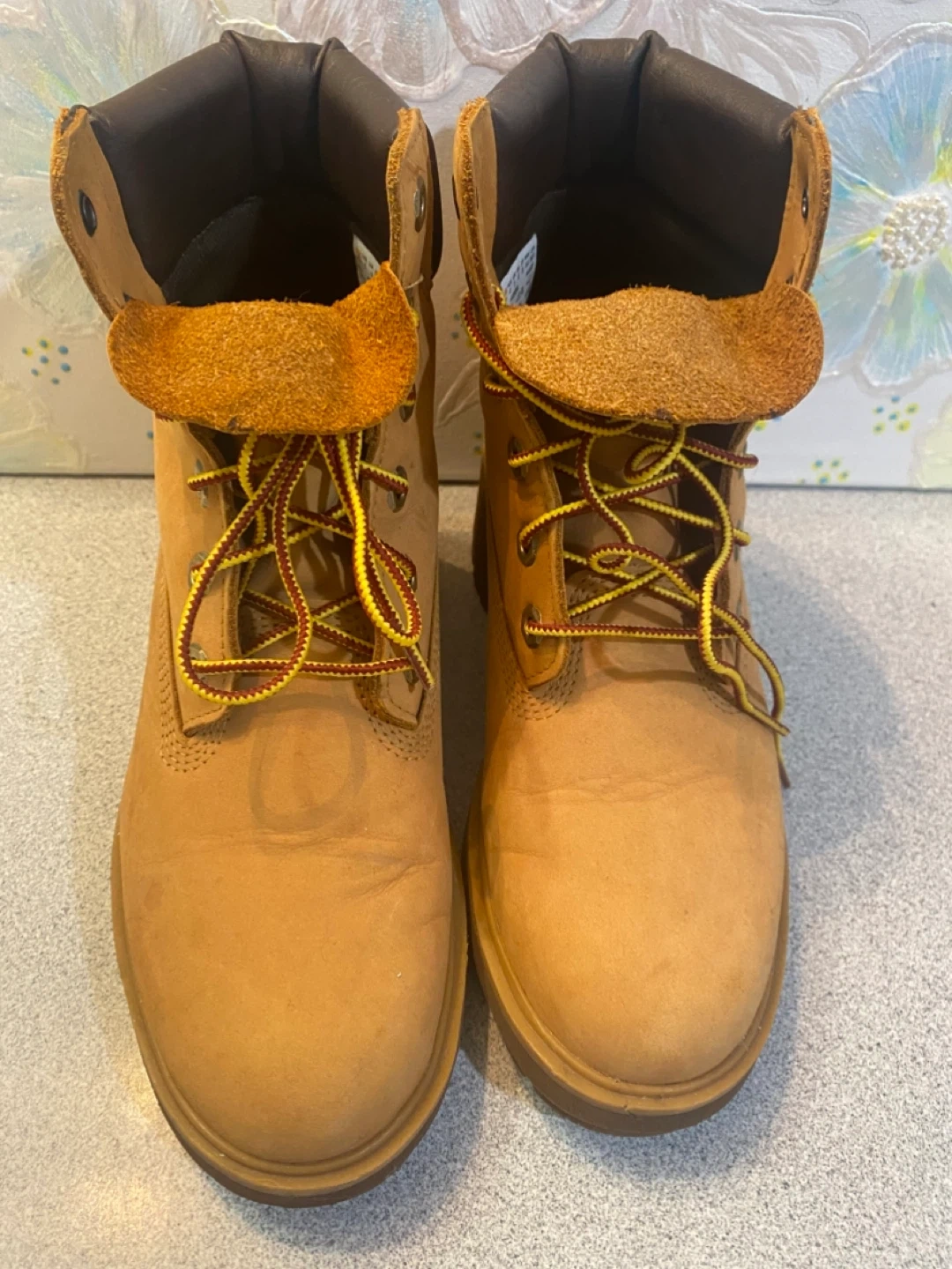 Selling a pair of Timberland waterproof boots in women's size US 8. They are a classic tan colour with brown accents and have the Timberland logo on the side. They are in good condition and ready for a new home!