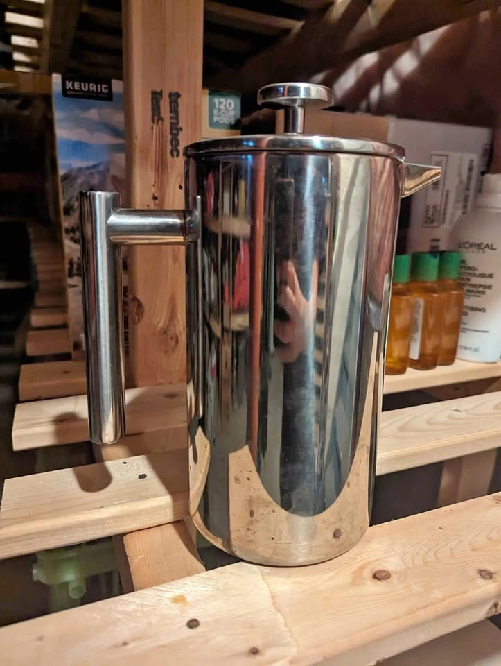 Stainless steel french press coffee maker. Got for a secret santa gift and only used a few times before we realized we are basic instant coffee people.