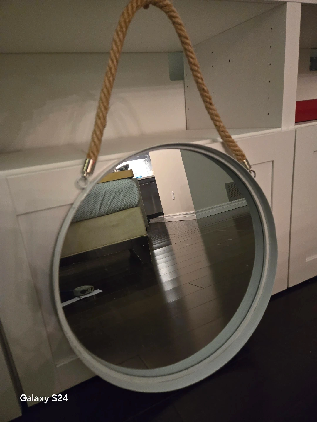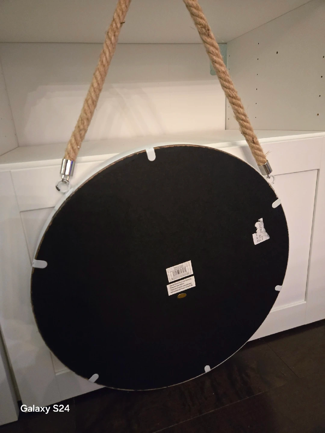 I'm selling a round wall mirror. It features a rope for easy hanging and a simple, clean design that would look great in any room! It's in excellent condition and ready to add a touch of nautical charm to your home.