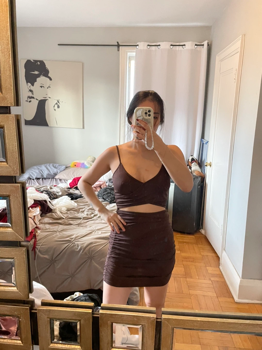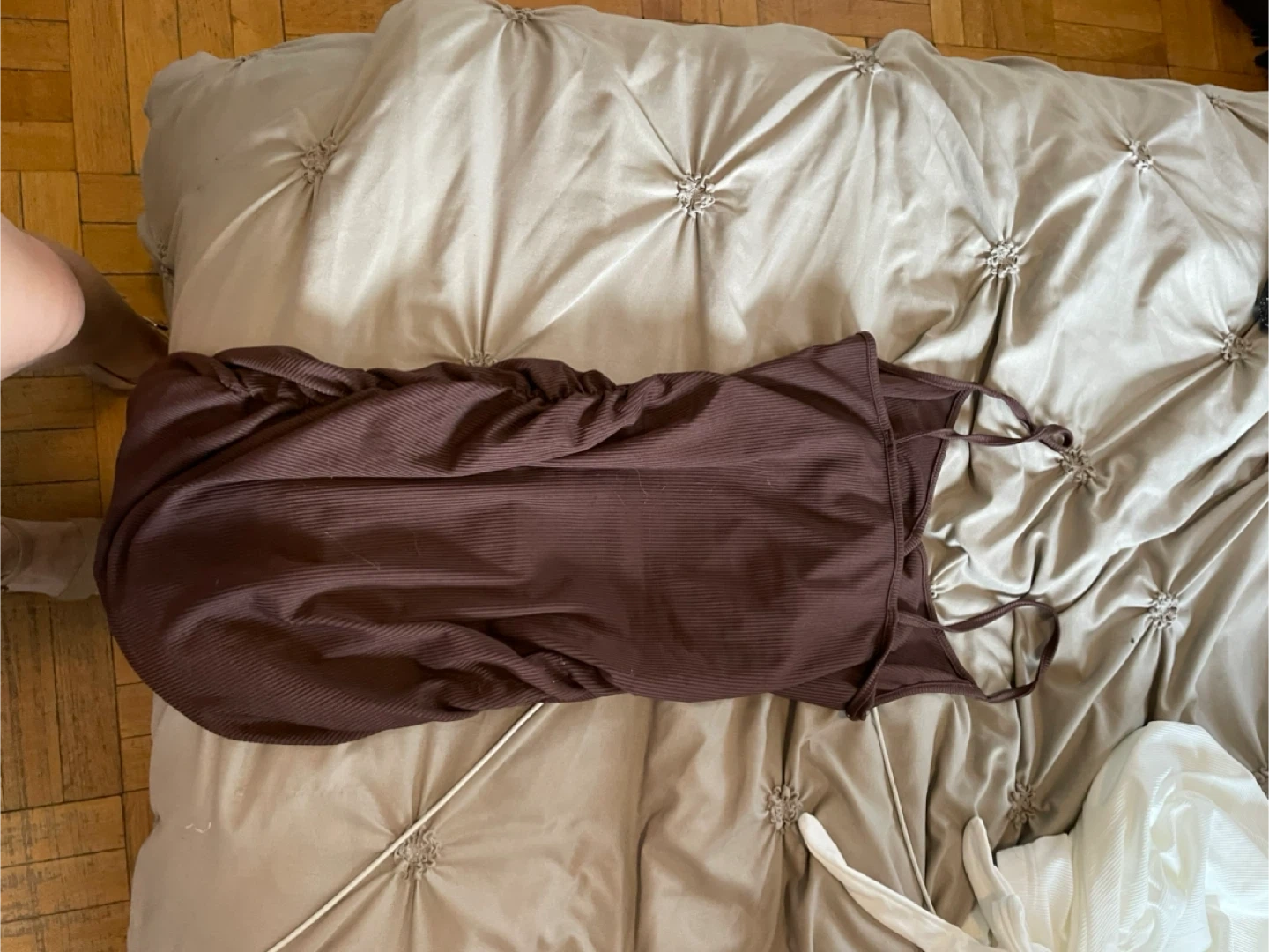 Selling a cute brown ruched mini dress! It's in great condition. Perfect for a night out or a special occasion. The dress features a flattering ruched design that hugs your curves in all the right places. It's made from a comfortable and stretchy material, making it easy to wear all night long