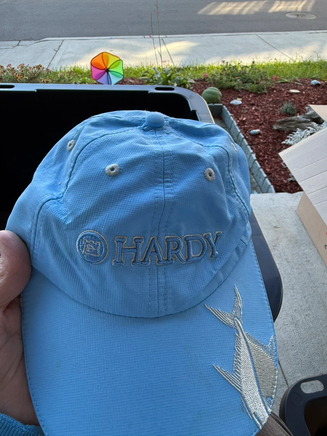 75Selling a light blue Hardy fishing cap! It features the Hardy logo and a fish design on the side. It's in great condition and ready for your next fishing adventure