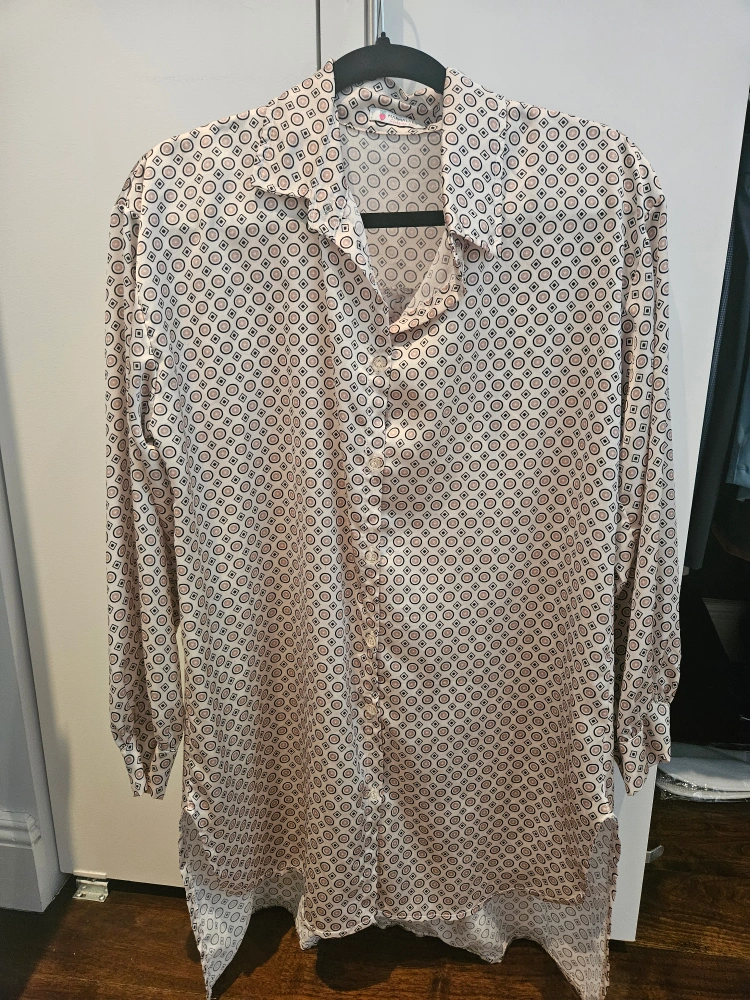 Here's a Pink Martini button-down shirt with a stylish pattern! It's in great condition and ready for a new home. The material feels nice and light, perfect for comfortable wear.