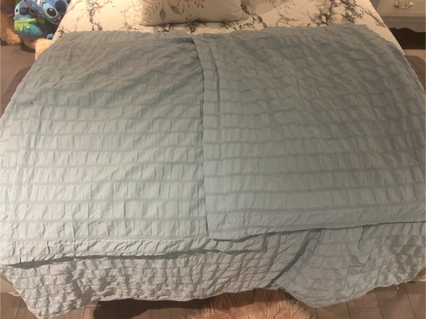 Here's a queen-size bed sheet set in a lovely blue colour. It's in great condition and ready to give your bedroom a fresh, clean look! Perfect for adding a touch of comfort and style to your bed.