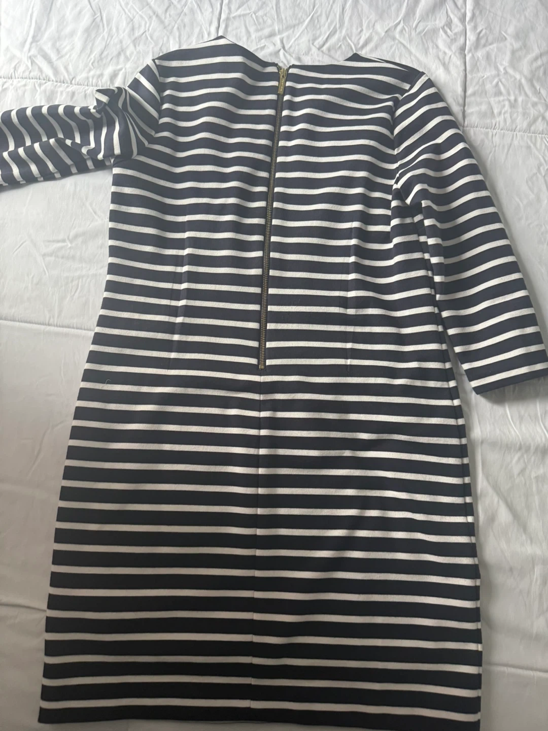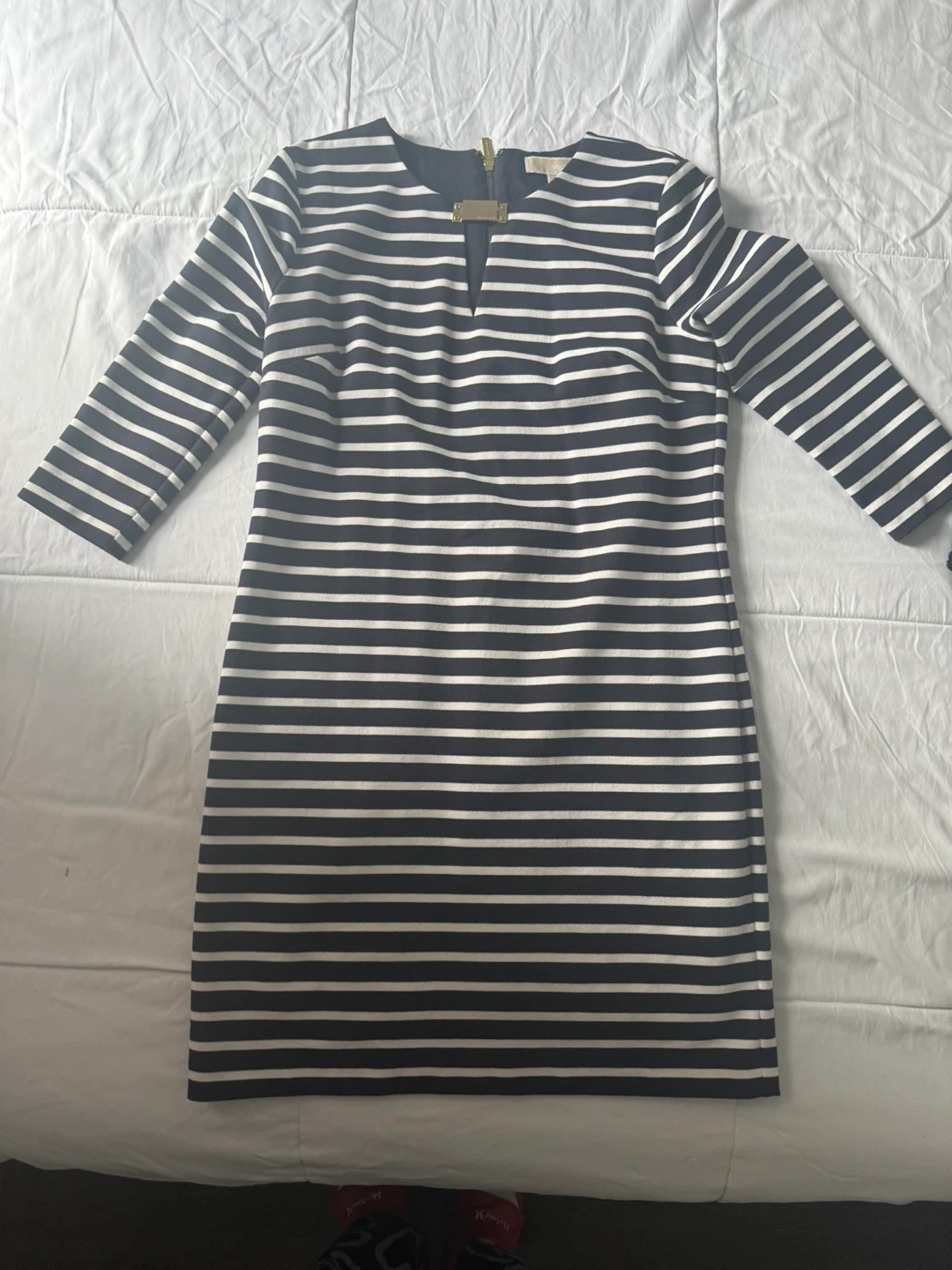 Here's a stylish Michael Kors dress in a classic striped pattern! It's a size L and features a gold-tone zipper detail. Perfect for a casual or semi-formal occasion!