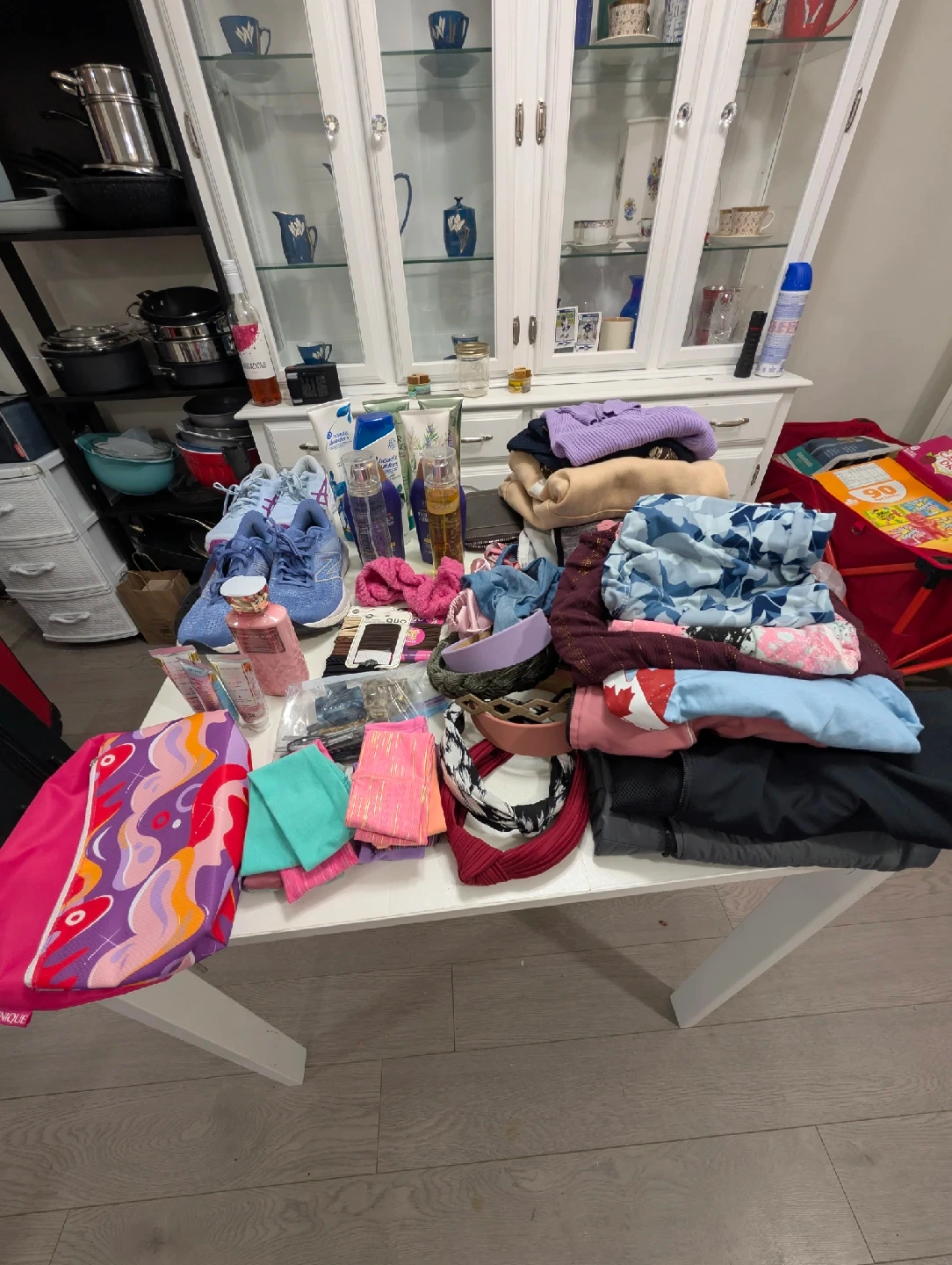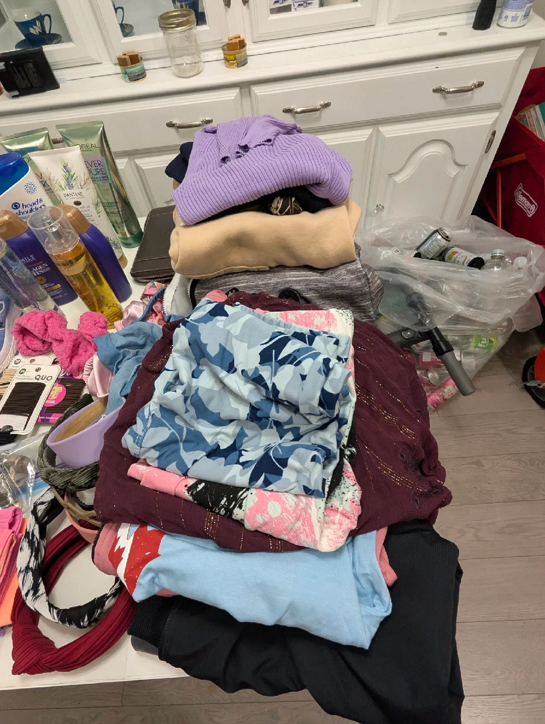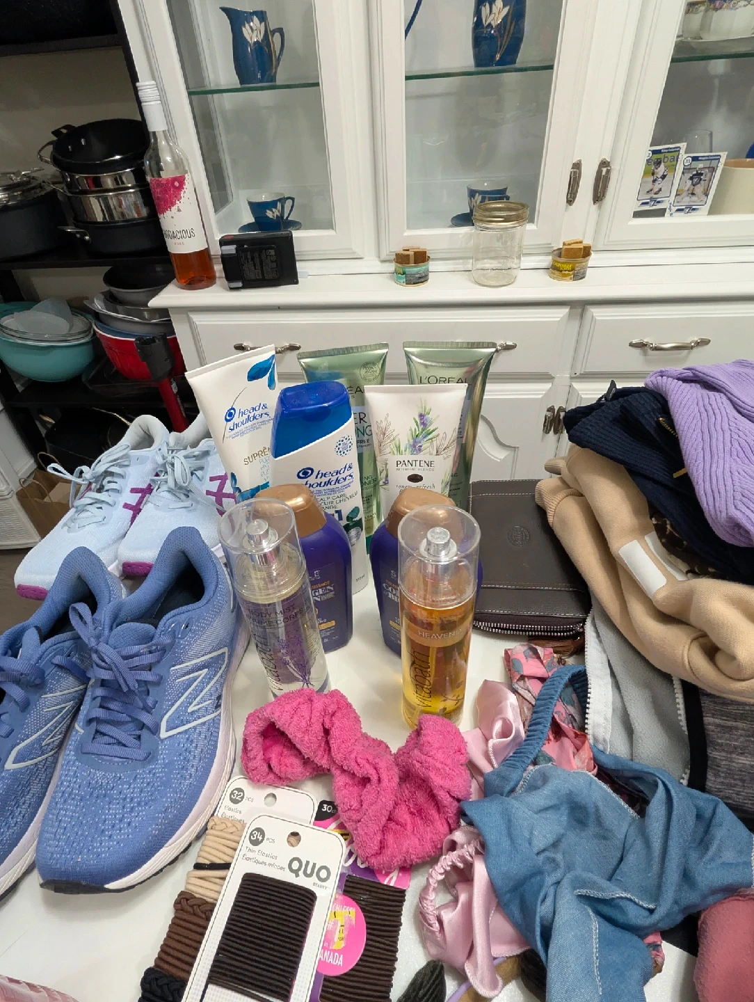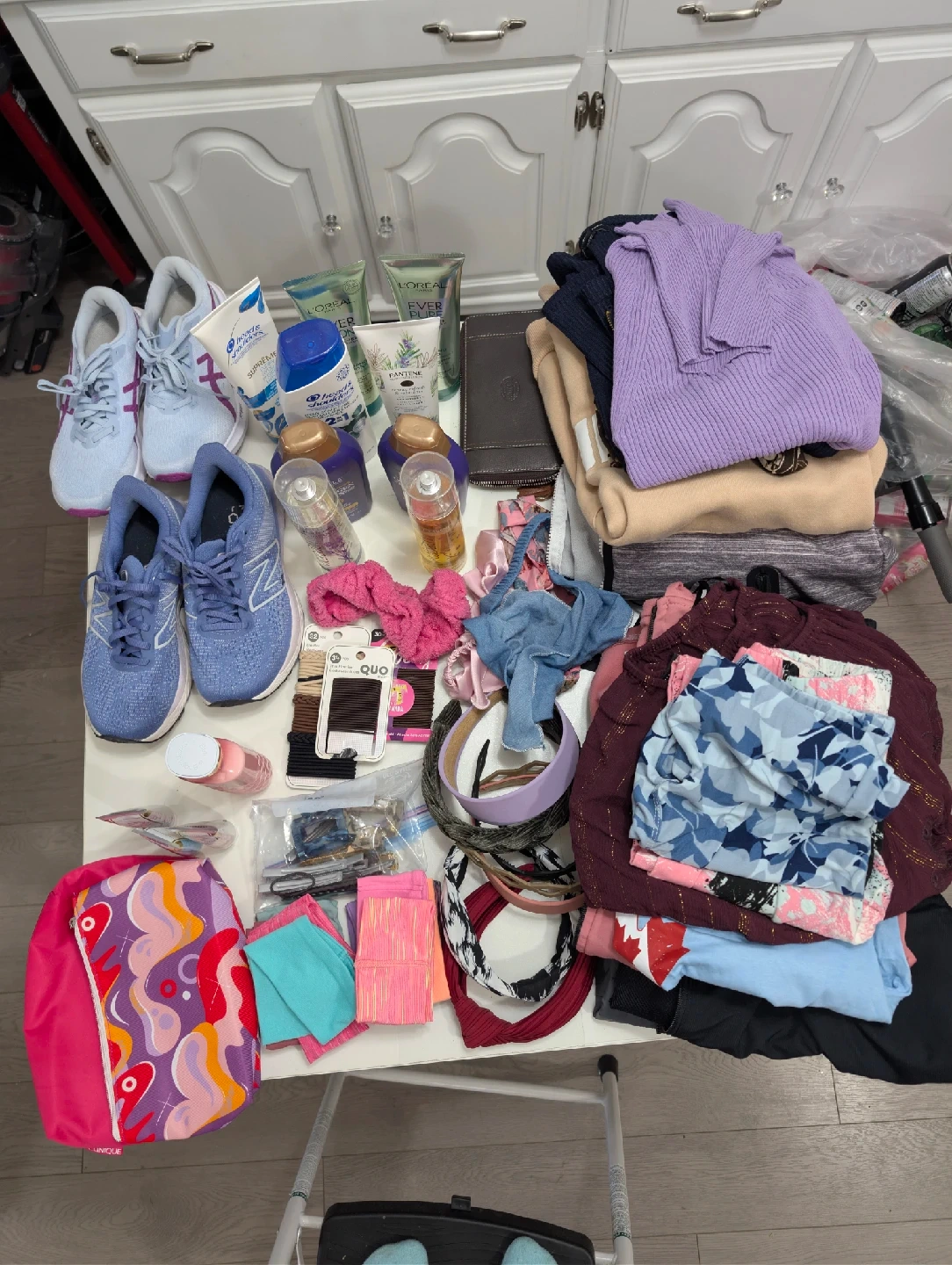 A collection of various items including shoes, women's clothes, toiletries, and accessories. sizes varies between small to lrg depending of type of item. shoe sizes are between 6.5-7. selling as a unit and would prefer to see it goes to a place that helps women or similar foundation. There are items not in pics are toques, a couple more hoodies, fleeced lined leggings size xs-s color dark green.
