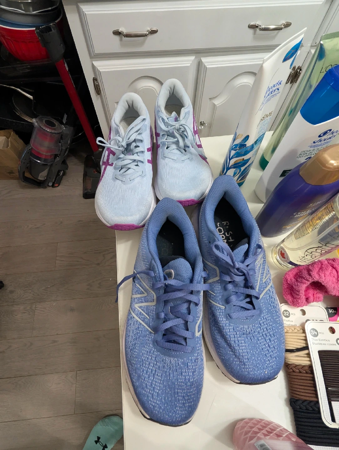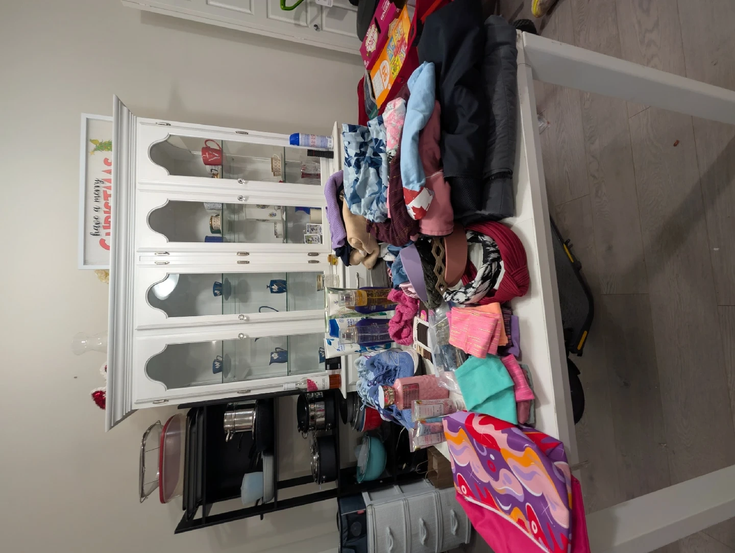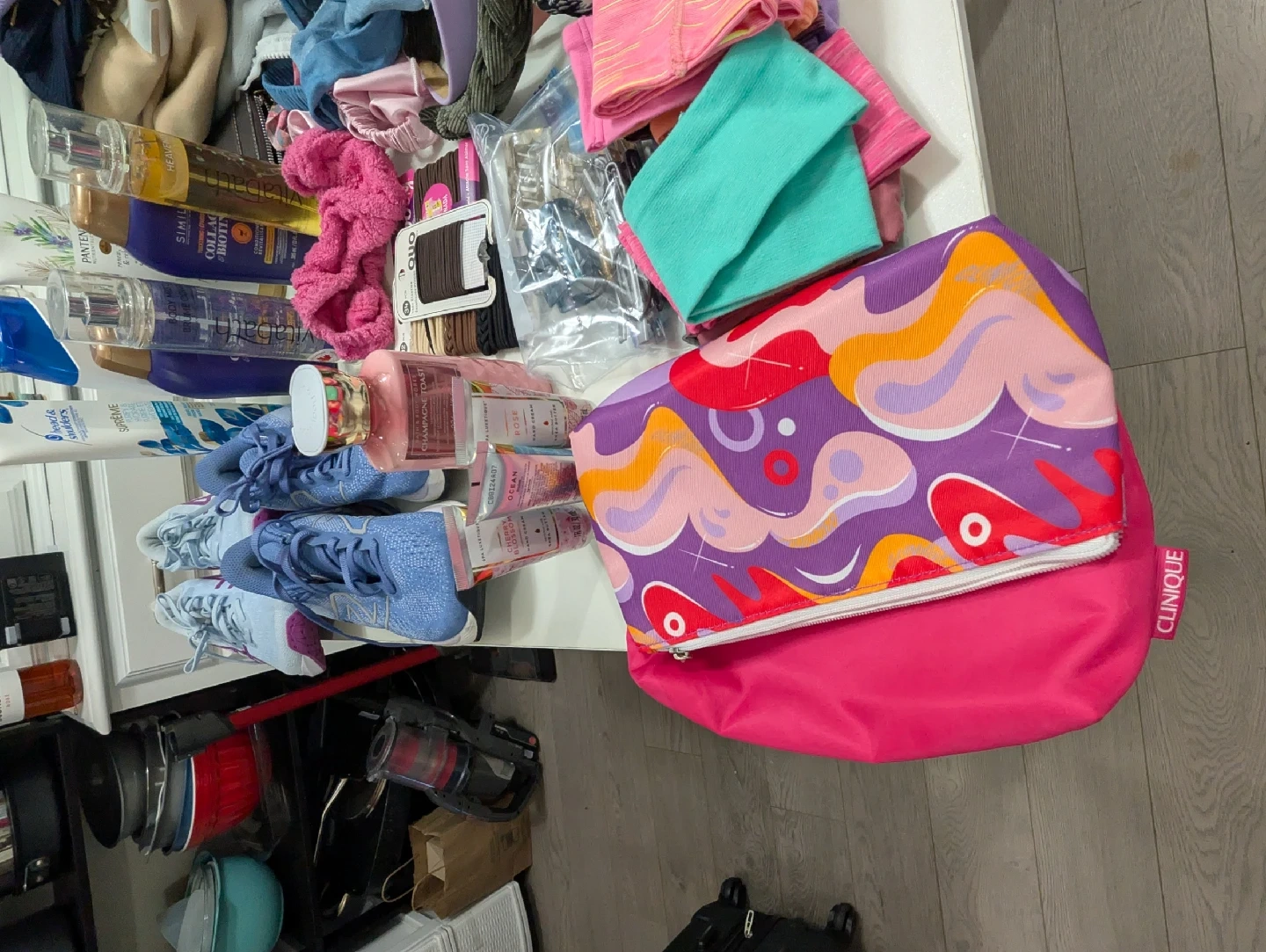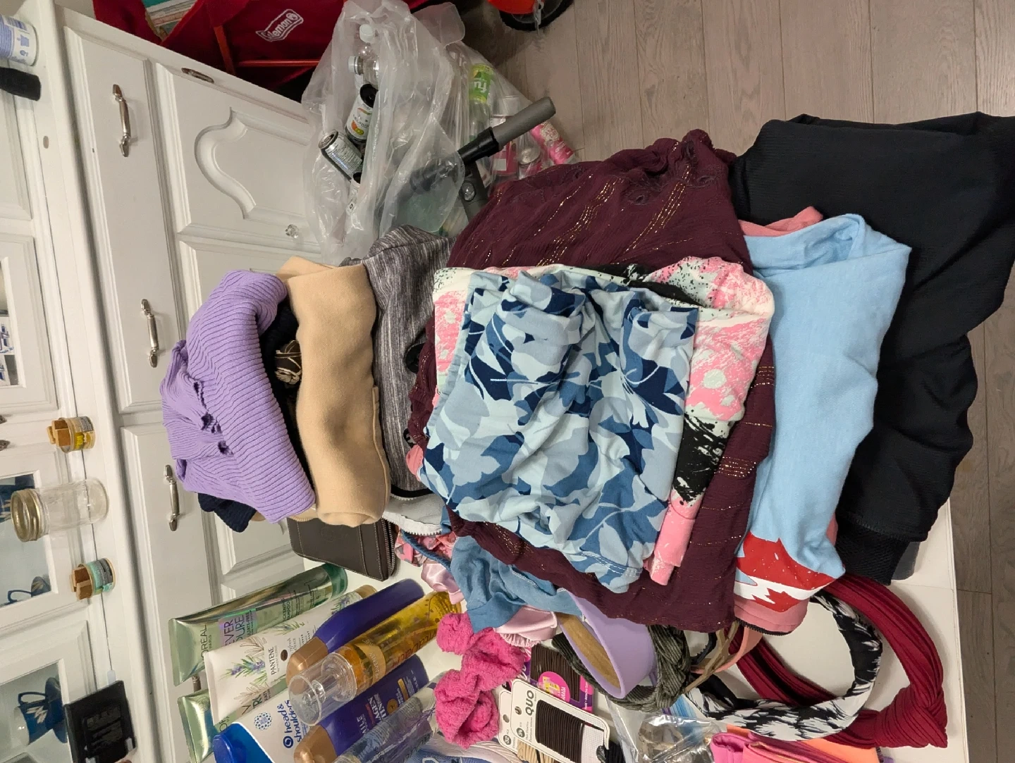 A collection of various items including shoes, women's clothes, toiletries, and accessories. sizes varies between small to lrg depending of type of item. shoe sizes are between 6.5-7. selling as a unit and would prefer to see it goes to a place that helps women or similar foundation. There are items not in pics are toques, a couple more hoodies, fleeced lined leggings size xs-s color dark green.