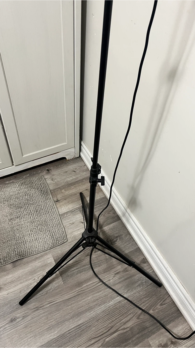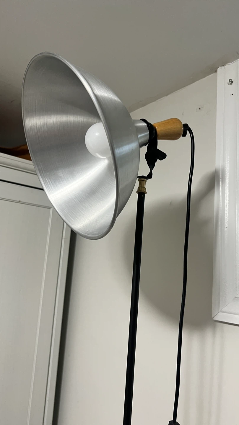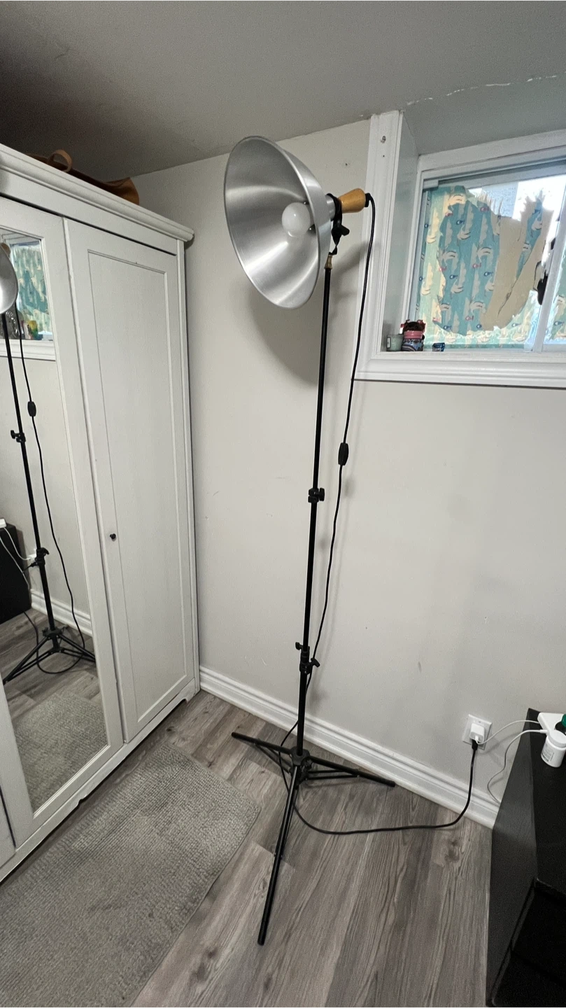 Selling an adjustable floor lamp! It features a silver-coloured shade, a wooden accent, and a black stand. It's in great shape and ready to brighten up your space. Asking $35