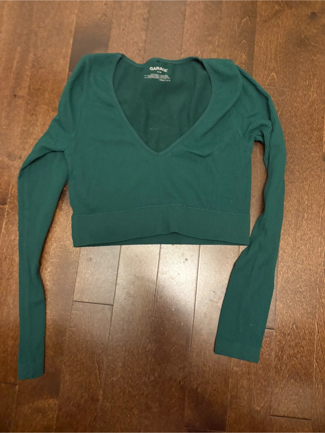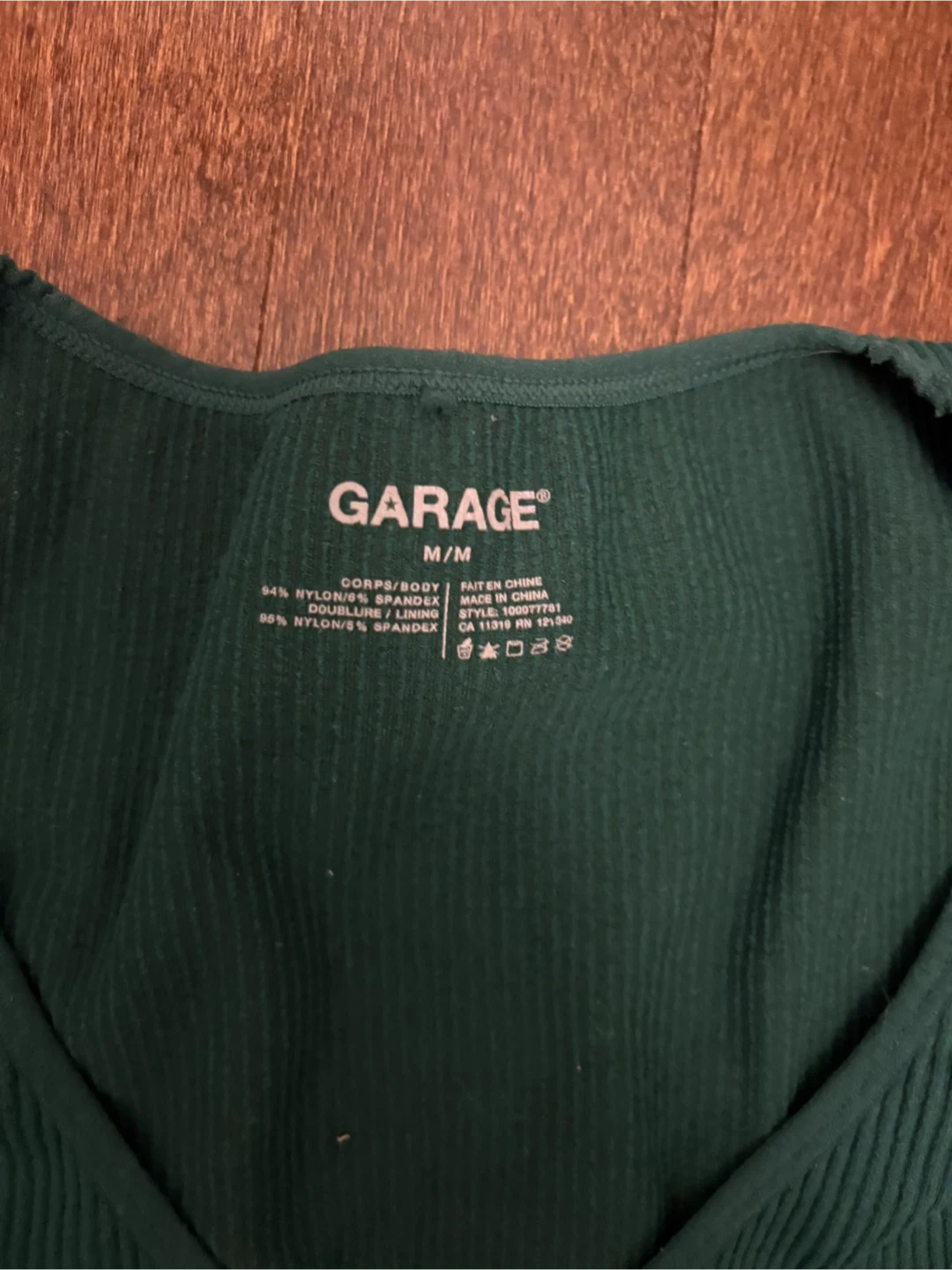 This is a Garage long sleeve top in a beautiful green colour. It's a size M and made of 94% nylon and 6% spandex for a comfortable fit. Perfect for layering or wearing on its own!