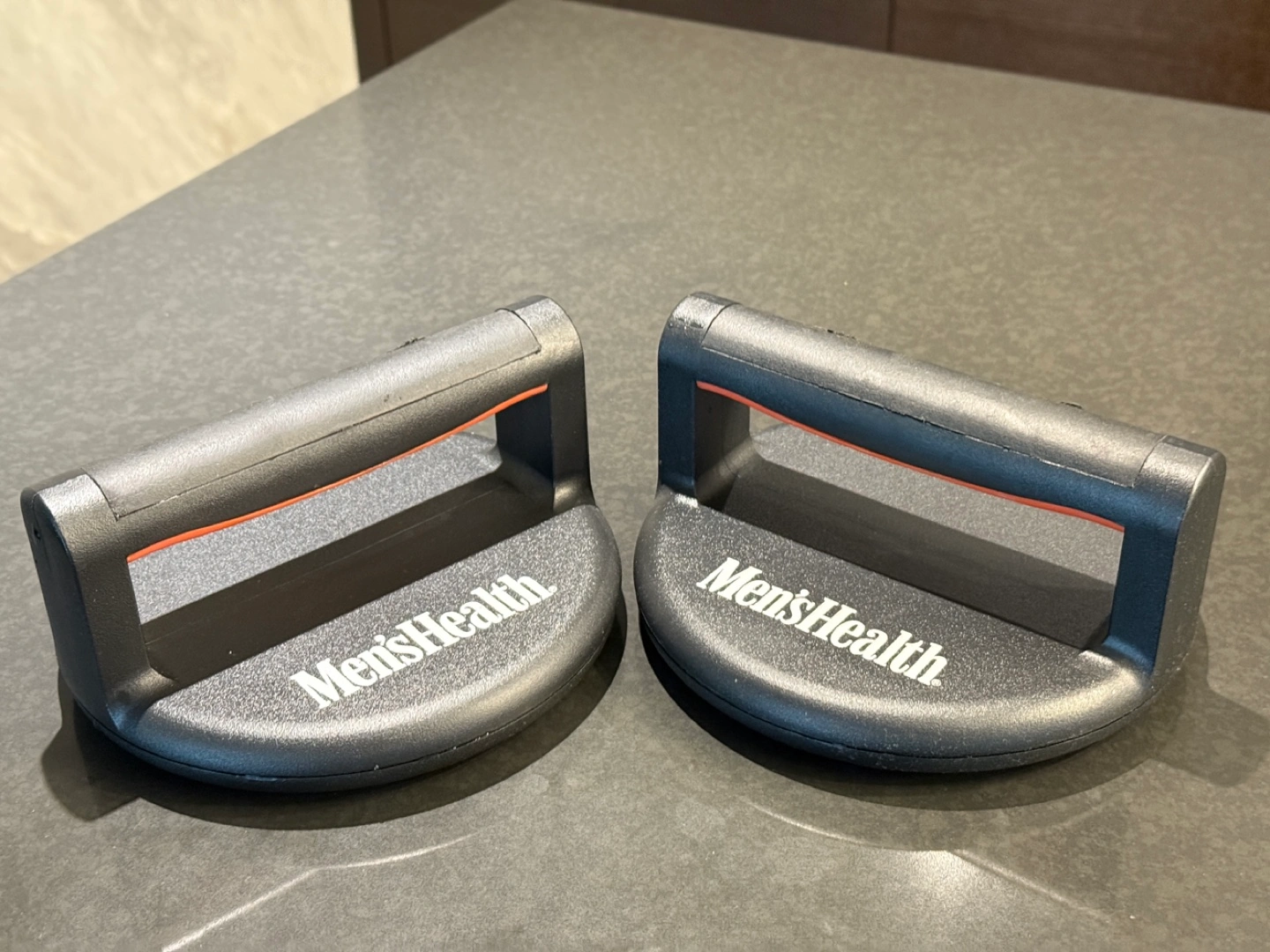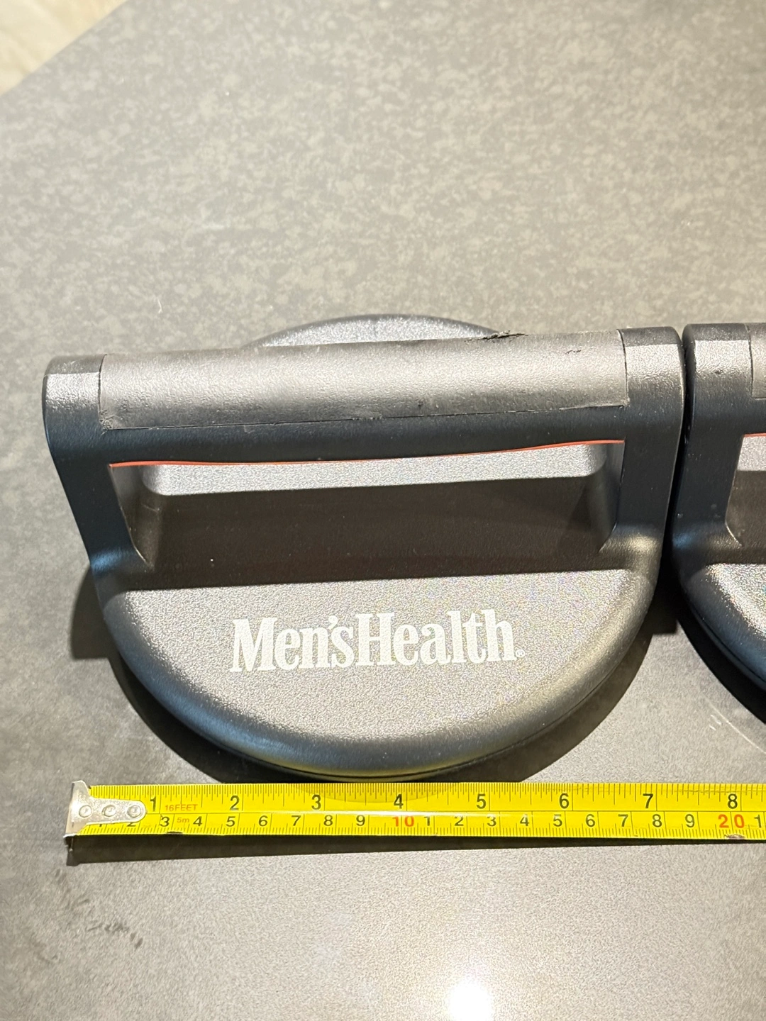 Selling a pair of Men's Health push-up stands! They're in great shape and ready to help you level up your workouts. The stands are black with a touch of orange, and they measure about 4 inches tall. Perfect for anyone looking to improve their push-up form and get a deeper range of motion