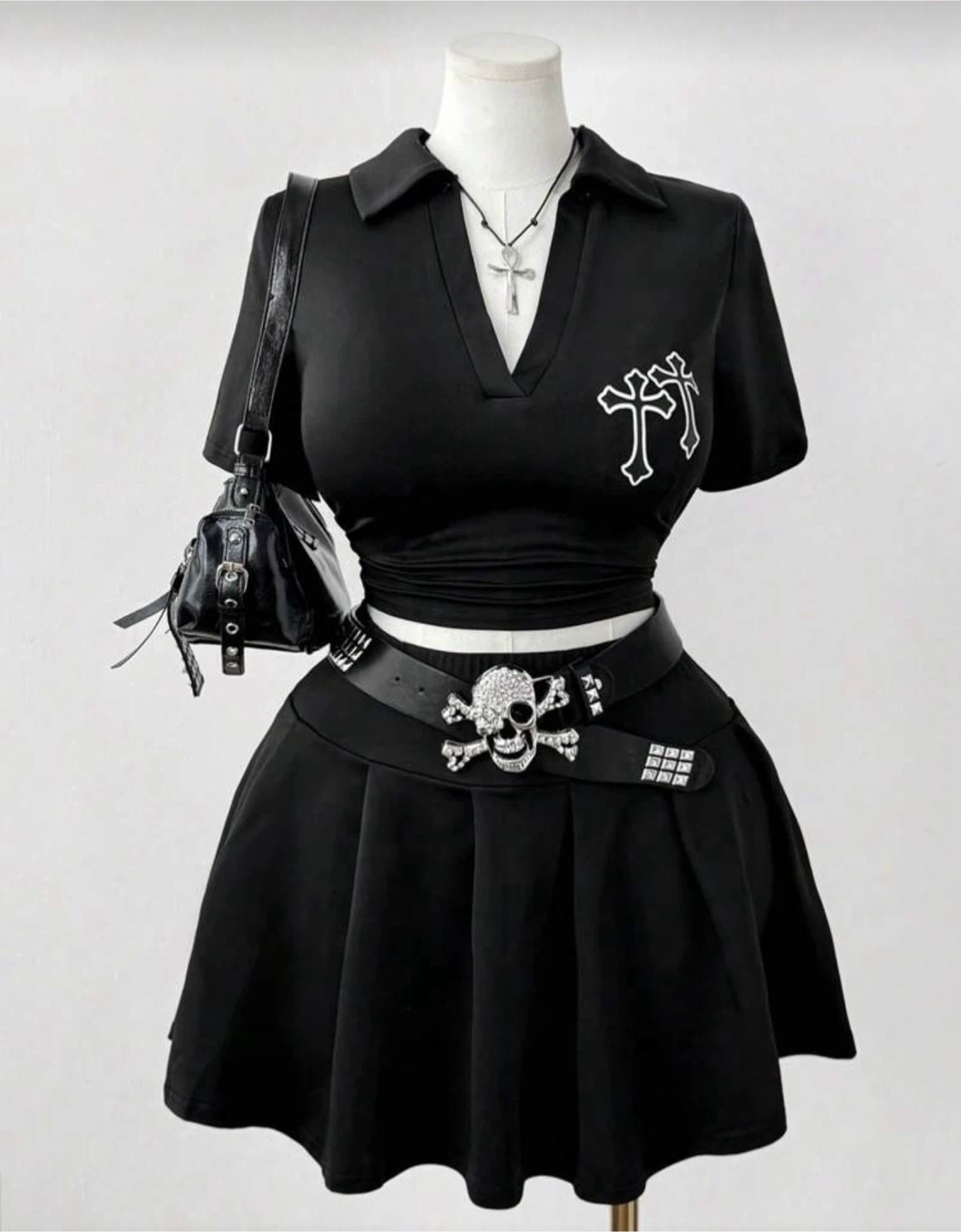 Selling a super cute black gothic style skirt set! The set includes a collared crop top with cross detailing and a matching pleated mini skirt. Perfect for adding a touch of edgy style to your wardrobe. (It doesn’t include the belt and the skirt is too big for me so I don’t wear it)