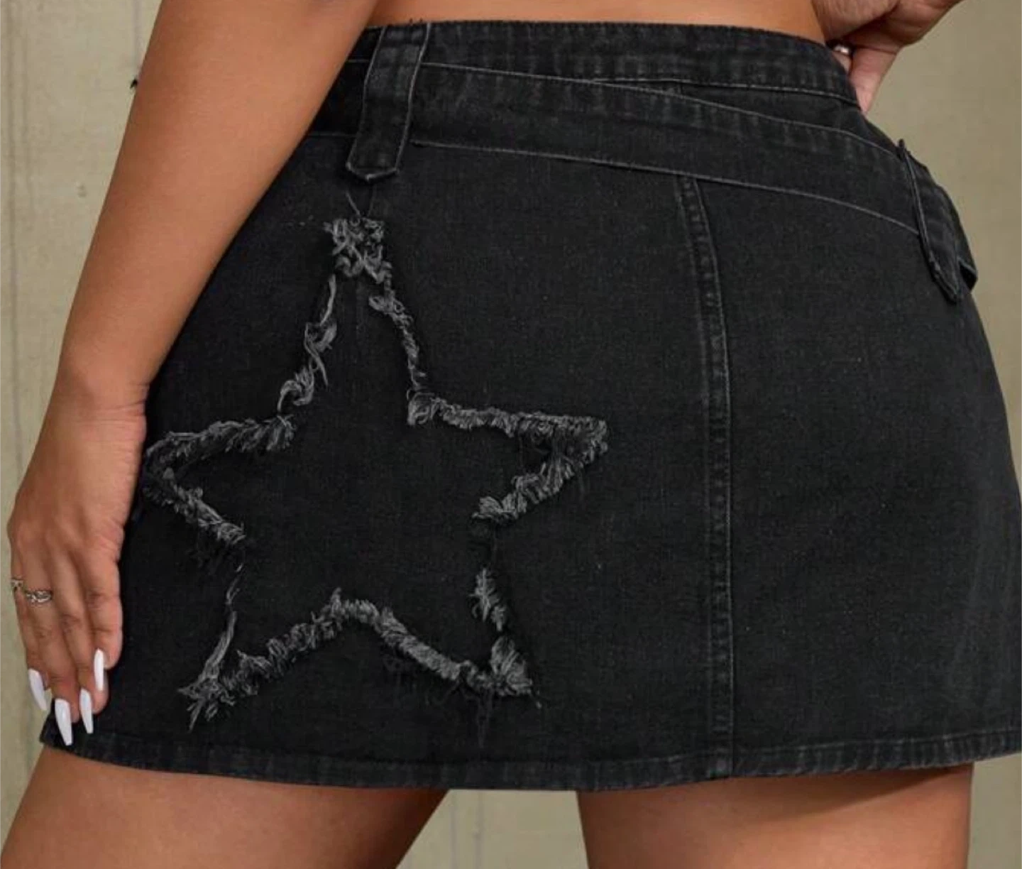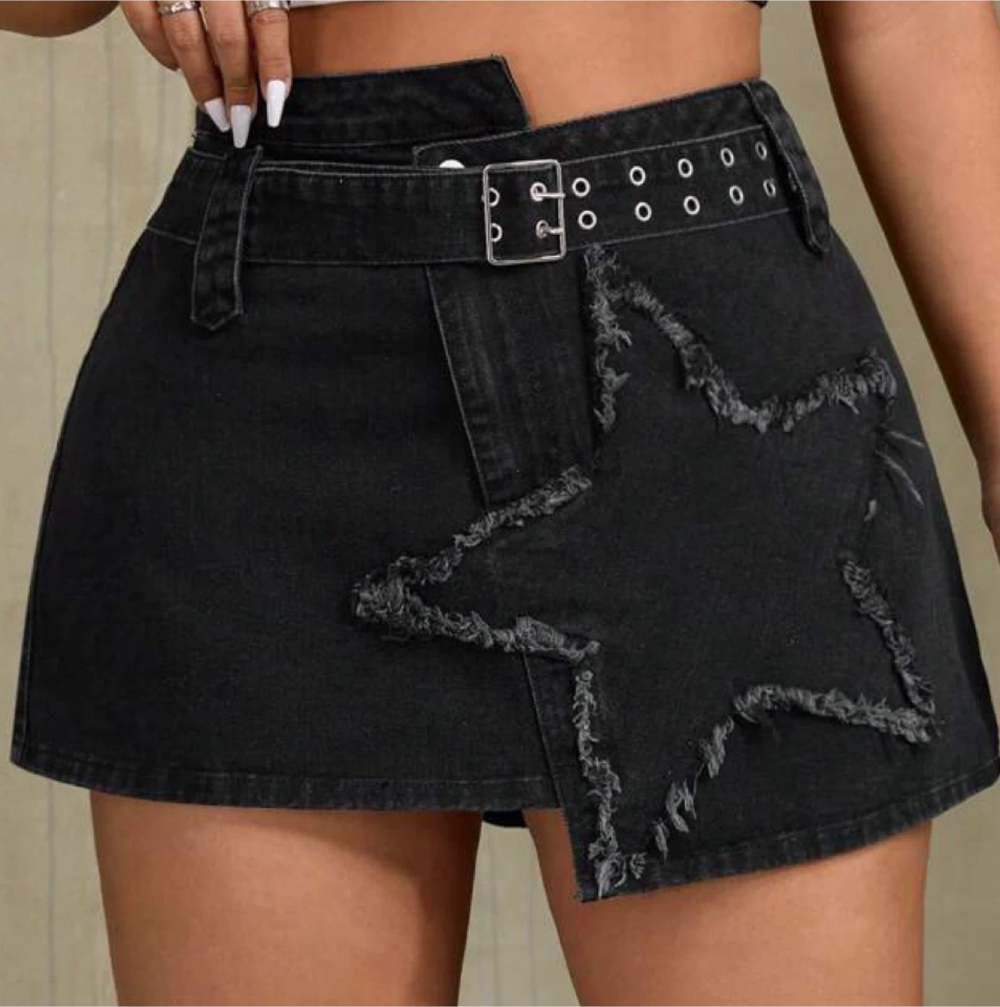 Check out this cute black denim mini skirt! It features a unique star design and a stylish belt detail. Perfect for adding a bit of edge to your wardrobe. It’s a bit too big for me.