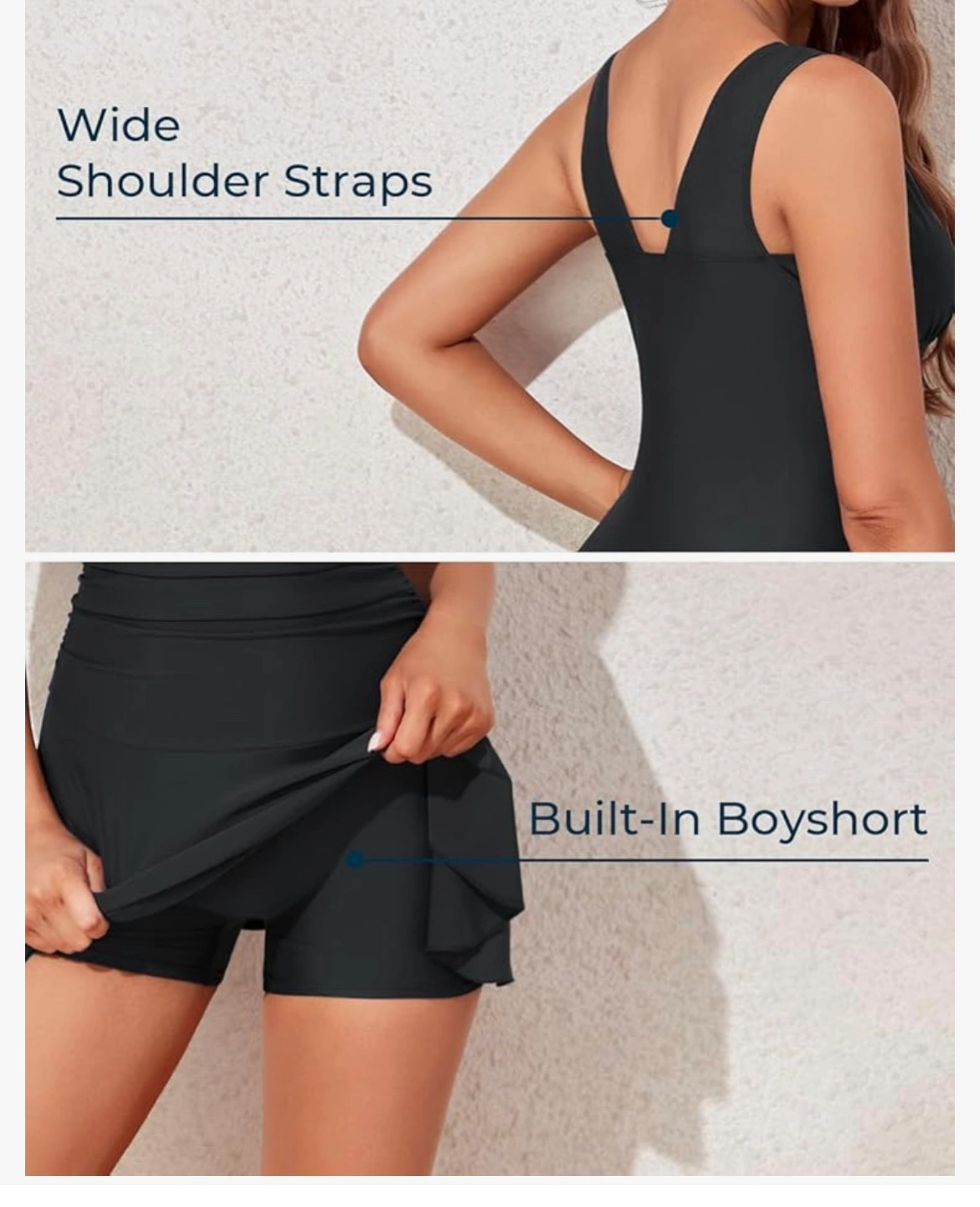 Summer Mae swimsuit dress in black, size 3XL. It features wide shoulder straps and built-in boyshorts for extra comfort and coverage. Perfect for the beach ,pool, hot tub or vacation