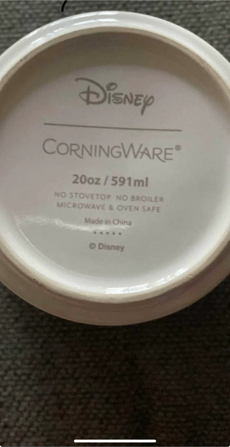 Selling a Disney CorningWare meal mug! It's 20oz/591ml and comes with a vented plastic cover. It's microwave and oven safe, but not for stovetop or broiler use. The mug has a cute Minnie Mouse design!