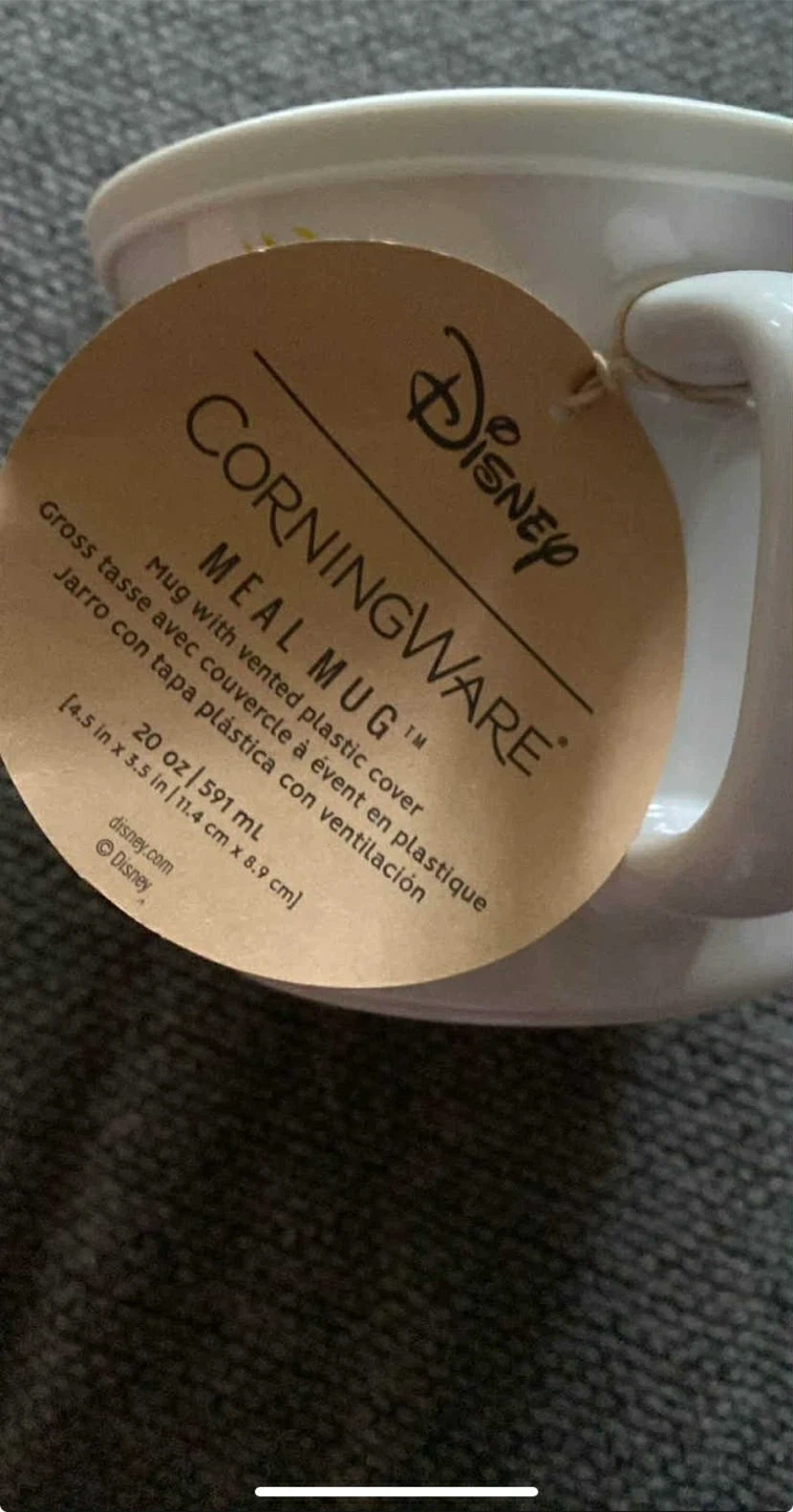 Selling a Disney CorningWare meal mug! It's 20oz/591ml and comes with a vented plastic cover. It's microwave and oven safe, but not for stovetop or broiler use. The mug has a cute Minnie Mouse design!