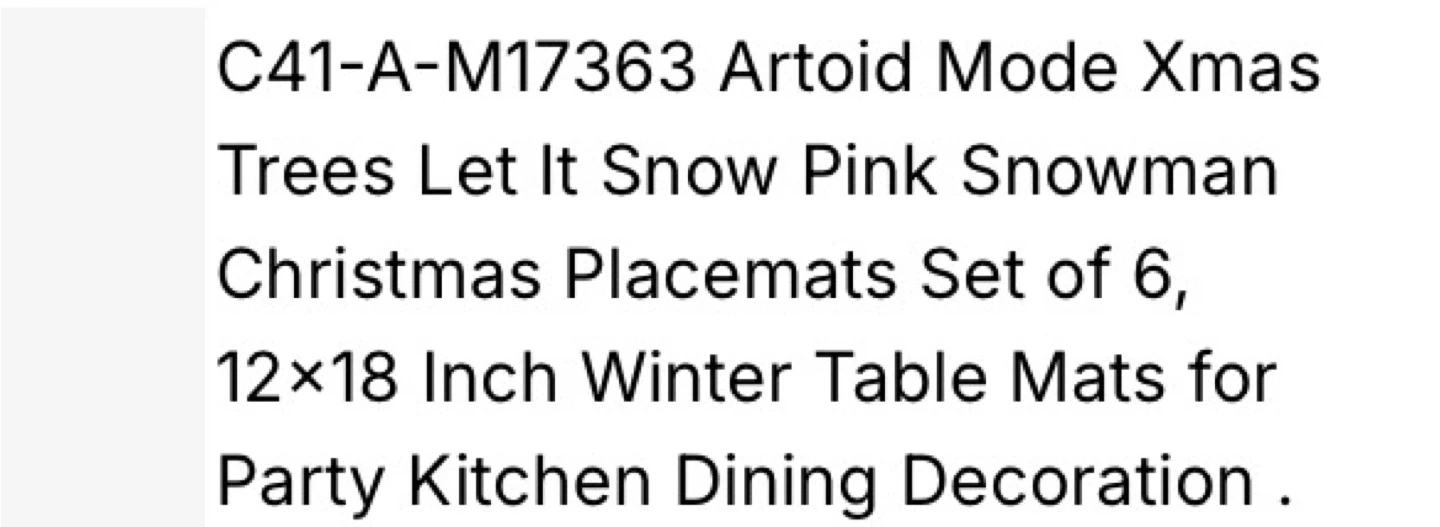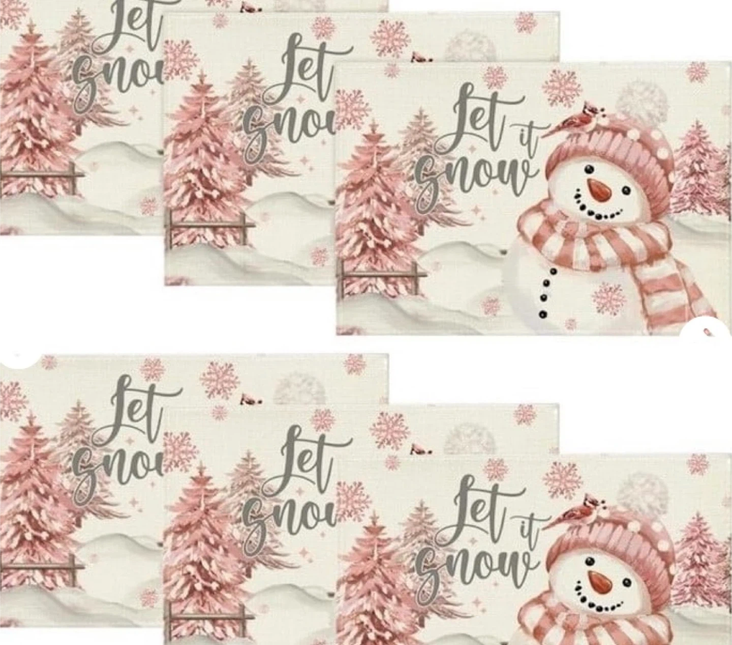 Selling a set of 6 Artoid Mode Christmas placemats. They feature a cute pink snowman and Christmas trees with a "Let it snow" design. These placemats measure 12x18 inches and are perfect for adding a festive touch to your kitchen or dining room this winter! Priced for quick pick up. Pick up from Border of Brampton and Caledon.