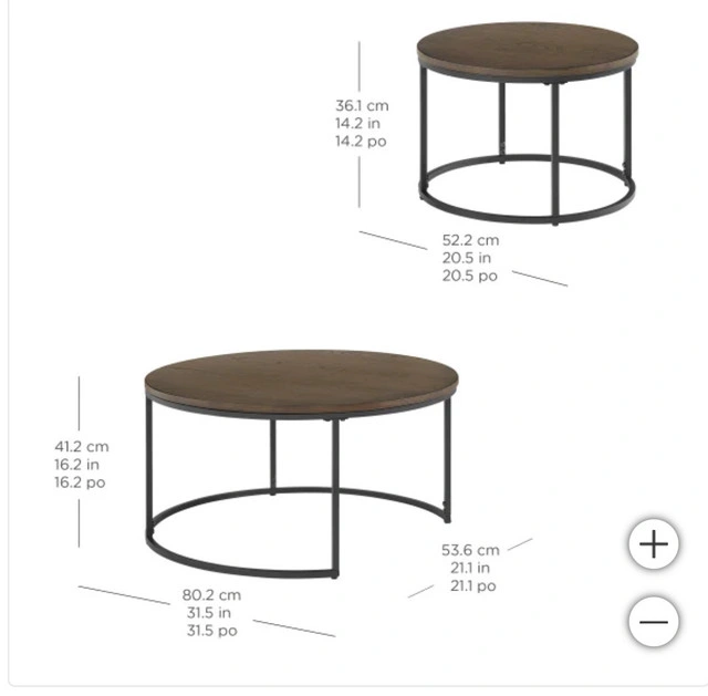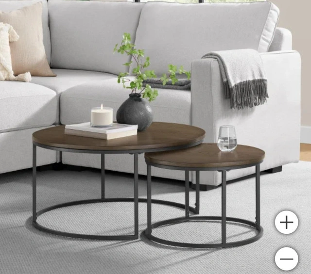 Brand new Bayside Furnishings nesting tables. The set includes two round tables with a wood-look top and sleek metal base. These tables are brand new and still in the original packaging, ready to assemble. Perfect for small spaces, these tables can be used together or separately to create a stylish and functional arrangement.