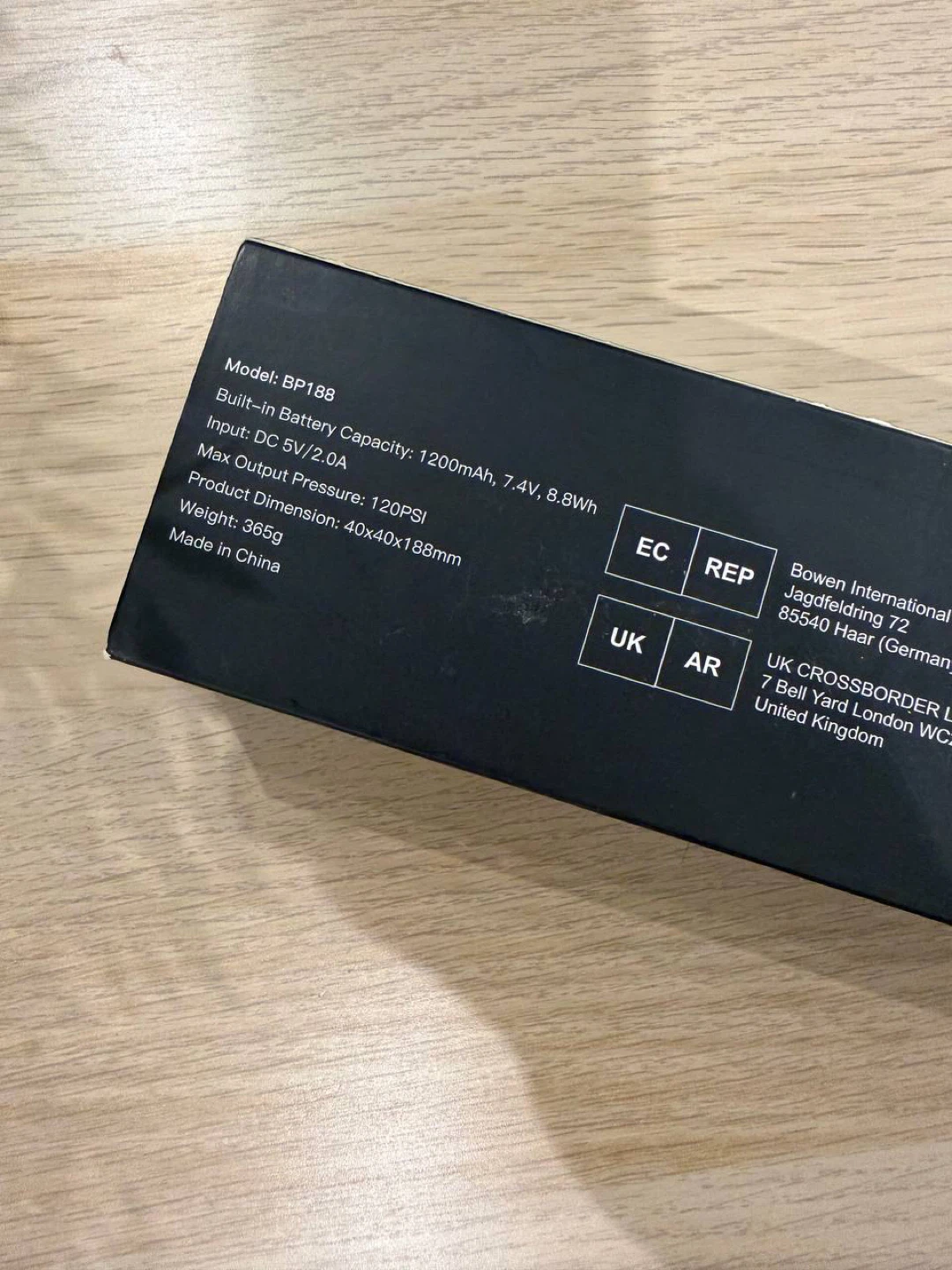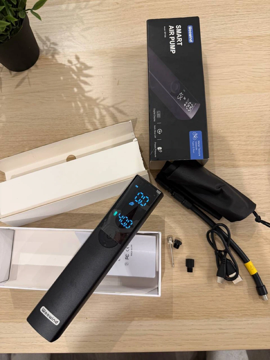 Selling a brand new Woowind Smart Air Pump, model BP188! It comes in its original box and includes all components. This pump is great for inflating balls, motorcycle tires, mountain bike tires, road bike tires, and even car tires. It features an LED digital display, auto shut-off, and is lightweight and portable. Dimensions are 40x40x188mm.