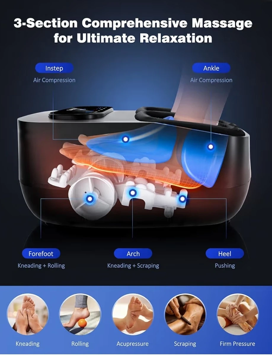Treat your feet with this OKNOZE foot massager! It features 3 level heating therapy and deep kneading rolling massage to relax tense muscles. It also has adjustable air compression with 3 intensity levels. Fits whole family, larger massage space suitable for all types of feet, max US size 12. Get ready for a comfort experience!