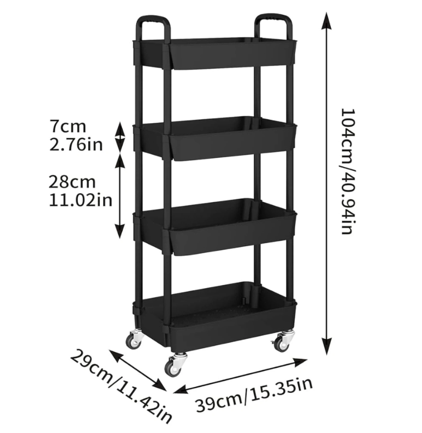 This handy black rolling cart is perfect for adding extra storage to your kitchen, bathroom, or craft room! It features four tiers of baskets, making it easy to organize all your essentials. The cart is on wheels, so it's easy to move around wherever you need it. Dimensions are approximately 40.94 inches tall, 15.35 inches wide, and 11.42 inches deep