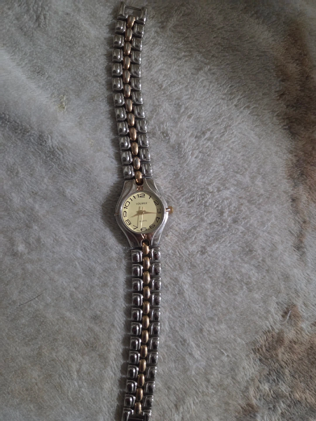 60Selling a Youmex ladies watch with a two-tone band (silver and gold). It's a quartz watch with a cream-colored face. A stylish and classic timepiece!