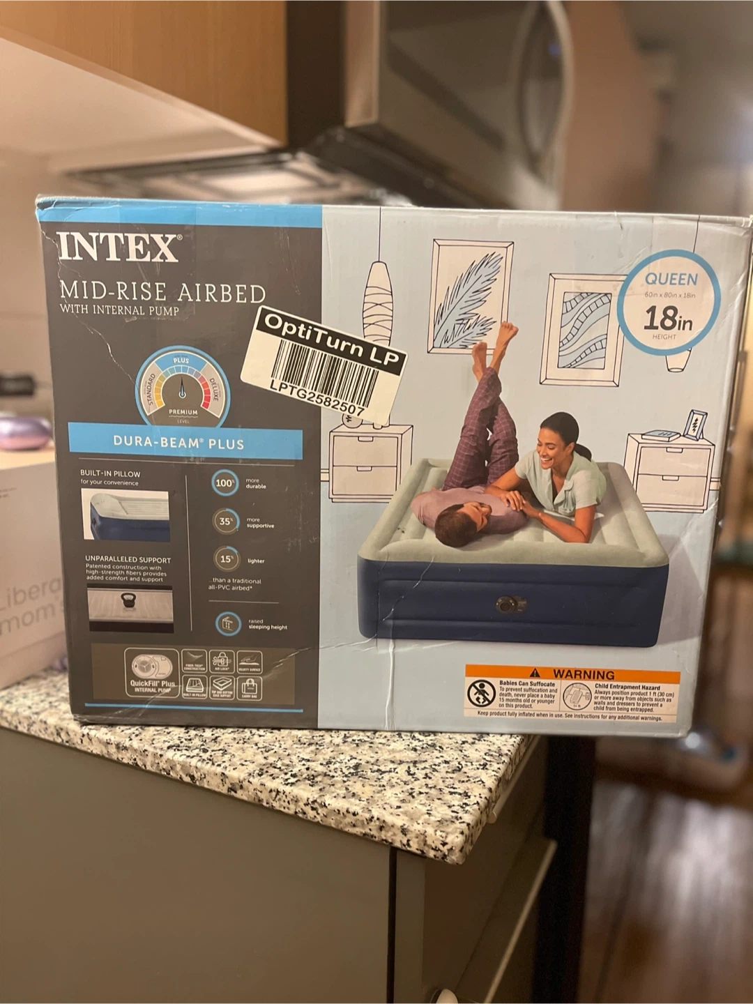 10Selling a new Intex Dura-Beam Plus mid-rise airbed with internal pump in Queen size. It's 18 inches in height and features Fiber-Tech construction for added comfort and support. The airbed includes an internal pump for easy inflation and deflation. Comes with the original box!