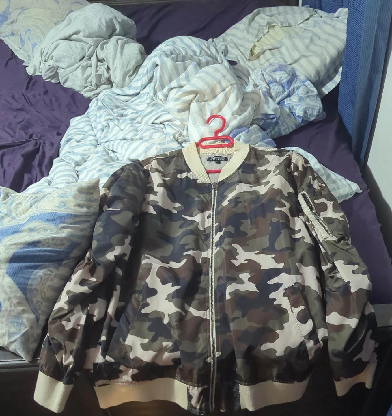 Selling a camouflage bomber jacket. It's in great condition and ready for a new home! The jacket features a classic bomber style with a full zip and a cool camouflage pattern.