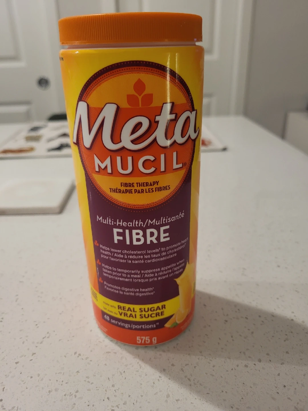 Selling a container of Metamucil Fibre Therapy in orange flavour! It's a multi-health fibre supplement that helps lower cholesterol levels and promotes digestive health. The container has 575 grams of product. Expiry date is December 2025. Hasn't been opened.