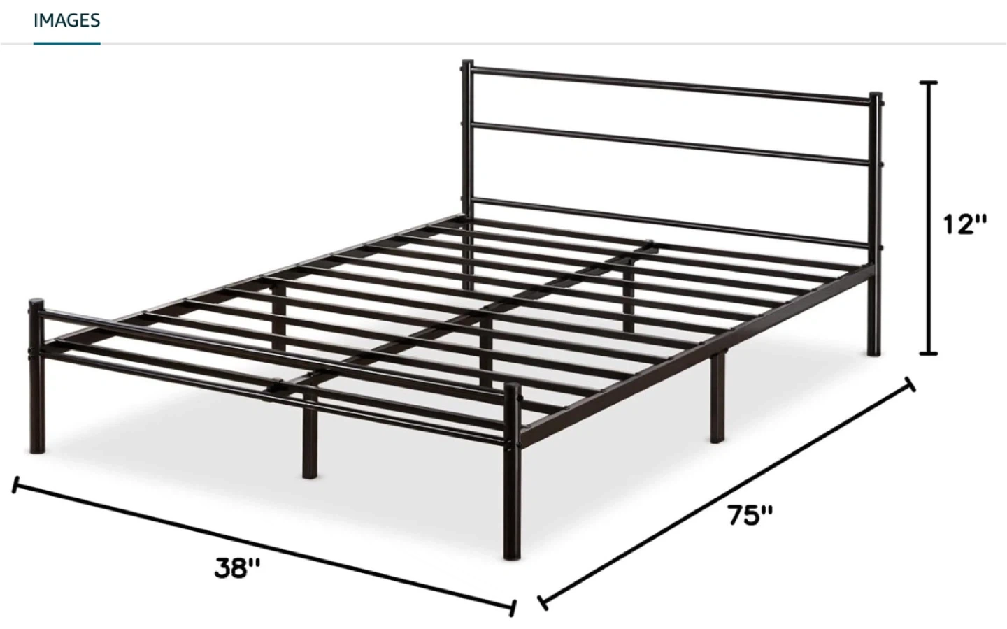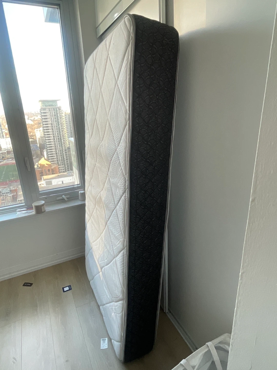Selling a twin size metal bed frame in black and A twin size distinction series Mattress. The dimensions are approximately 75 inches long, 38 inches wide, and 34 inches high at the headboard. It's a simple and sturdy frame, perfect for a small space or guest room. Dm me for pick up
