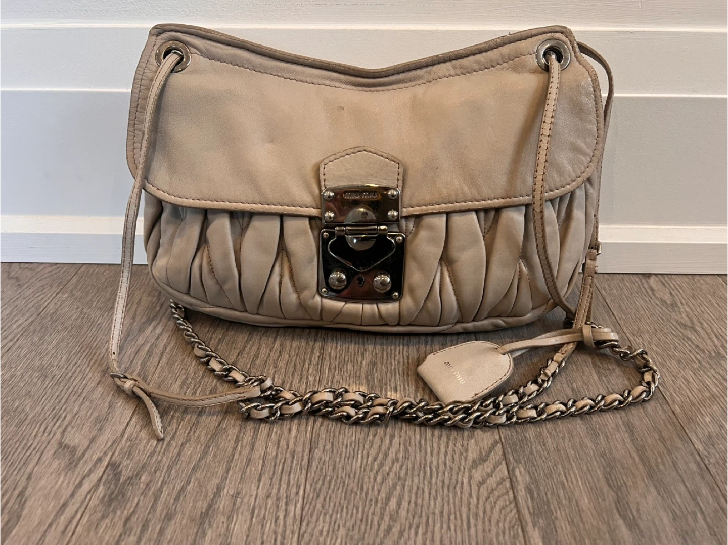 Selling a Miu Miu shoulder bag in grey leather and gun metal hardware. It features a chain strap and a distinctive gathered design. Comes with the dustbag and two keys. The bag shows some signs of wear, but still has lots of life left! Strap is adjustable to be crossbody or shoulder.