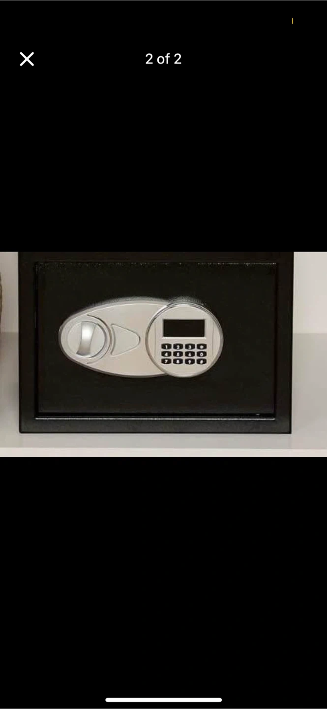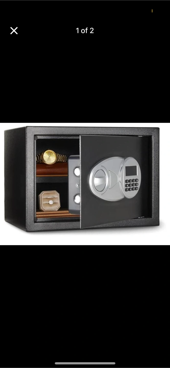 Here's a digital security safe box, perfect for keeping your valuables secure! It's in great condition and ready to use. The safe is black and features a digital keypad for easy access. Great for home or office use!