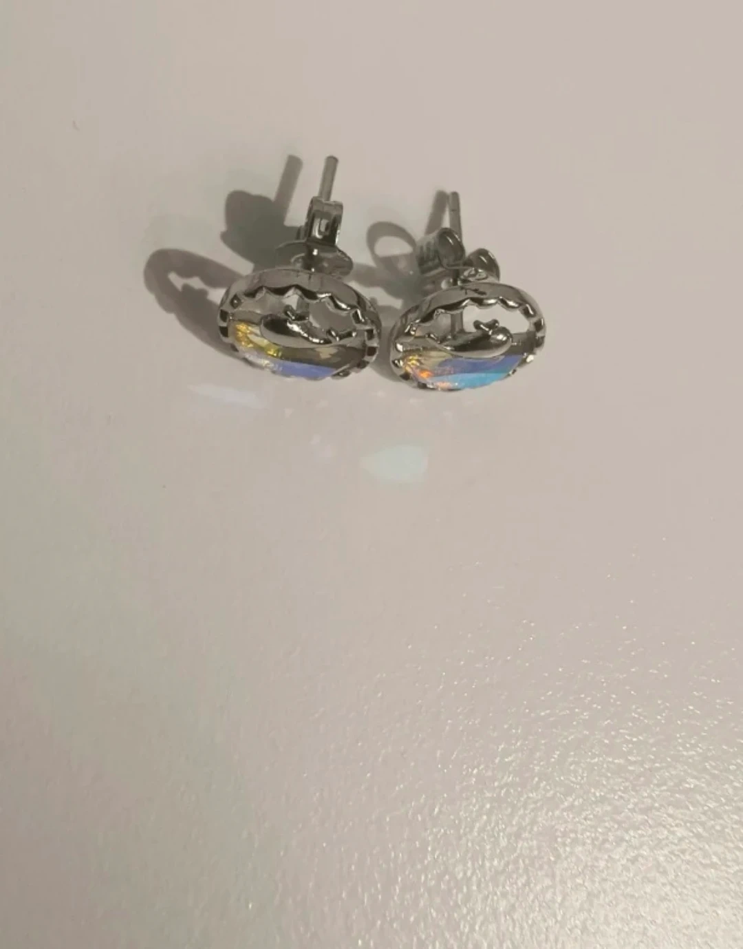 These earrings feature a cute whale design inside a circular frame. They have a subtle iridescent shimmer that catches the light nicely. Perfect for adding a touch of whimsy to your outfit!